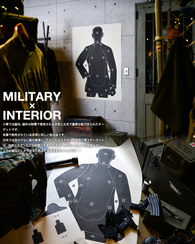 米軍で使用されていた非常に珍しい放出品です。日本では見かけない紙の質感と、アメリカならではの雰囲気が漂うターゲットは、当然エアガンなどの射撃にも良いですが、ポスターとしてお部屋やガ レージや店舗などにさりげなく飾ると無茶苦茶オシャレです!豪華に額に入れたりしてディスプレーするのもアリです。