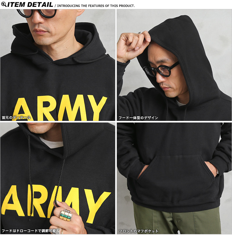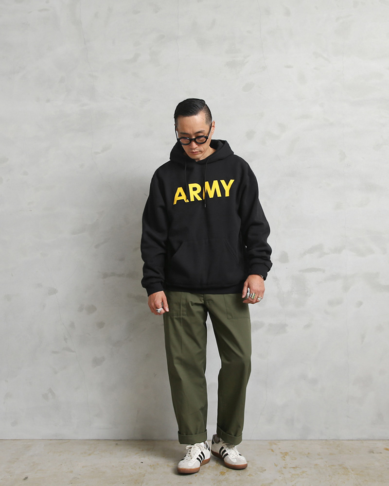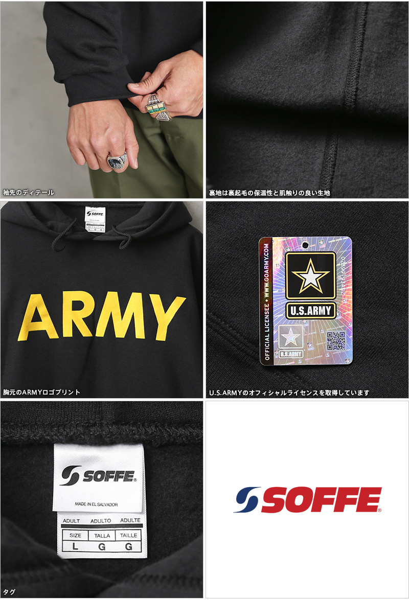 | 商品説明 | SOFFE ソフィー 9388-0000119 ARMY プリント プルオーバー スウェットパーカーのご紹介です。 品番:9388-0000119 SOFFEからアメリカ軍のオフィシャルライセンスを取得しているコットン50%、ポリエステル50%の裏毛仕様の9オンスのプルオーバータイプのスウェットパーカーが入荷しました。 「ARMY」ロゴがラバープリントで施されたシンプルなスウェットです。フロントにマフポケットが付きます。 ブラックボディーにイエローのプリントが際立ちます。 トレーニングからルームウェアのみならずタウンユースでオシャレに着こなせる非常にお勧めのスウェットパーカーです。シンプルだからこそ様々な用途に使えるアイテムはこういった良い物をセレクトして下さい! |
