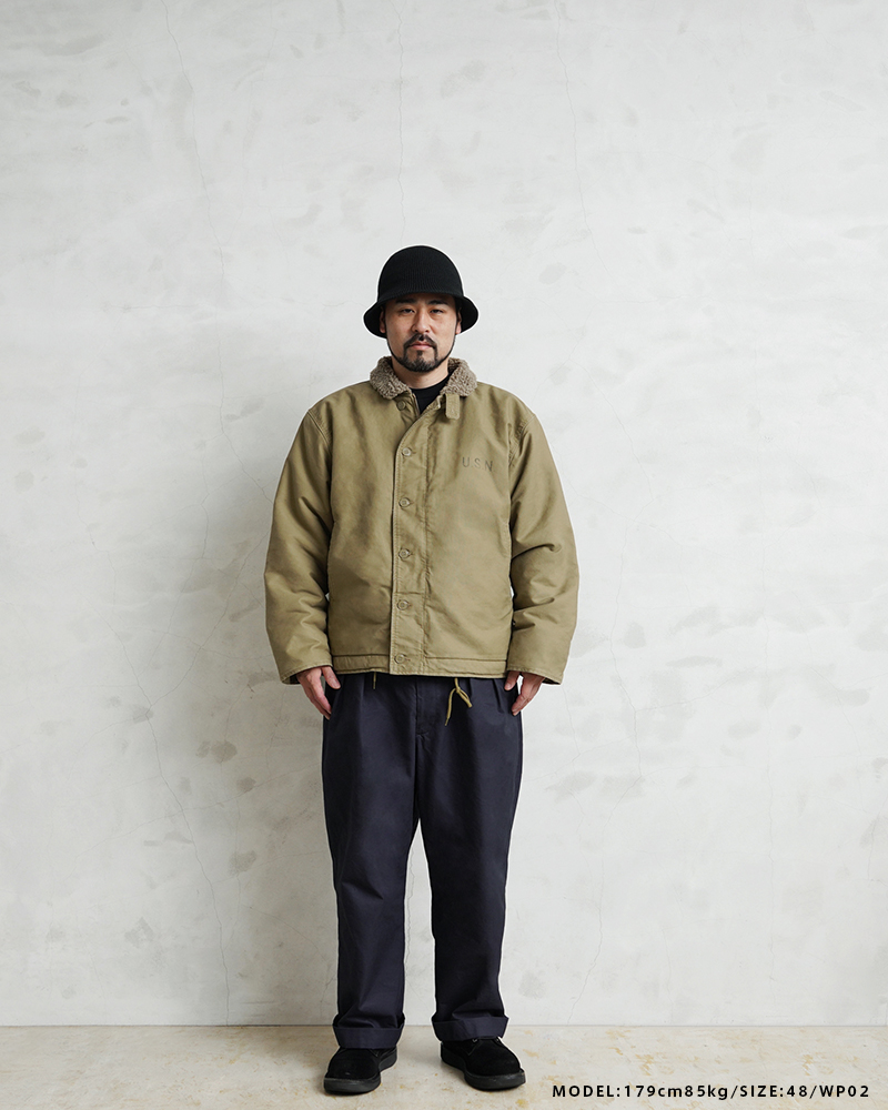 | 商品説明 | 米海軍 U.S.NAVY N-1 デッキジャケット SOLID&U.S.Nステンシル WAIPER.inc のご紹介です。 制式名称:N-1 DECK JACKET 品番:WP01,WP02 米海軍(U.S.NAVY)が生んだ傑作として名高く、多くのファンを魅了するミリタリージャケット「N-1デッキジャケット」をWAIPER.incが復刻再現! 当店でもブランドスタート当初から続くロングセラーアイテムとなります。 デッキジャケットという名が示すとおり、N-1はアメリカ海軍の甲板作業用として採用されたミリタリーウェア。 冬の海上における猛烈な寒さに耐えられるようにデザインされたジャケットがベースとなっており、言うまでもなく最高クラスの防寒性を発揮します。 袖口は段リブによってフィット感を高めたインナーカフス、裾には体型に合わせて絞り具合を調節出来るドローコード、ジッパーエレメント(歯)の腐食防止と隙間風を防ぐフロントのウインドフラップ、スタンドカラーでも着用できるチンストラップ付きの襟など、寒さを防ぐ工夫が各所になされています。ライニングは体温を逃さないよう袖先までボアで仕立てられており、抜群の保温性を発揮します。 表地にはジャングルクロスと呼ばれる高密度に織られたコットンファブリックを採用。着こむほどに体に馴染む風合いが魅力です。 防寒性に優れたライニングはアルパカを数年着込んだような、ボアフリースを使用。肌触りもよく、ウール特有のチクチク感が無く直接肌に触れても気持ちの良い着心地となっています。 こちらワンウォッシュをかけた雰囲気のあるボディにステンシルの有無が選択可能。カラーは定番のTAN、さらに古い年代で採用されていたNAVYの二色展開。 ヴィンテージを再現したU.S.Nのステンシル有りはもちろん、シンプルなデザインがお好きな方にはステンシル無しもおすすめです。 デニムやチノパンなど定番のボトムスとも相性抜群なので、普段の着こなしに羽織るだけでサマになるジャケットとなっています。 N-1デッキジャケットとは 1943年に制式採用された、アメリカ海軍を代表する甲板作業用のジャケット。初期型のシェルには太畝のコットンピケ、後期型からはジャングルクロスと呼ばれる細畝のコットンピケを採用。ライニングは防寒性・耐久性に優れたアルパカ(後にアルパカ×ウールの混紡に変更)となり、艦上や港での隠蔽性を考慮して後期型からはネイビーからタン(カーキ)へとカラーを変更。高い防寒性と完成度の高さが水兵達に高く評価され、一部では1960年代の初め頃まで使用され続けたミリタリージャケットの名作。 |