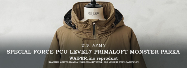| 商品説明 | 米軍 SPECIAL FORCE PCU LEVEL7 PRIMALOFT モンスターパーカー PERTEX UNLIMITED WAIPER.incのご紹介です。 品名:BEYOND MONSTER 品番:WP1024 WAIPER.incより高機能素材PERTEX UNLIMITEDを使用した特殊部隊(SPECIAL FORCE)仕様のモンスターパーカーのご紹介です。 PCU(PROTECTIVE COMBAT UNIFORM)という名称で製作されたアイテムは、ECWCS(EXTENDED COLD WEATHER CLOTHING SYSTEM)と同様に気候に合わせてレイヤリングを調整する特殊部隊向けに考案されたレイヤリングシステムとなります。 その中でもLEVEL7は最も外側に着用する保温性に優れたアウターの部類となり、珍しいコヨーテカラーは米軍コントラクターとして有名なBEYOND CLOTHING社が製造をしているモデルとなります。 当店でも人気のTYPE2 モンスターパーカーですが、こちらのアイテムはディテールにも違いがあります。 インパクトのあるシルエットは健在ですが、肩のベルクロパネルや肘のコーティングなどが廃止されており、袖や後ろ身頃には中綿の偏りを防ぐキルティングが施されています。特に球数の少ないBEYOND社製のモンスターパーカーはコレクターアイテムとしても人気を博しています。 市場でも出回ることが少ない希少なアイテムを、WAIPER.incでは素材やディテールまでこだわって製作させていただきました。 表地にはイギリスのPERTEX社が既存のアウトドアメーカー以外に向けて展開する"PERTEX UNLIMITED(パーテックス・アンリミテッド)"を使用。アウトドア、ミリタリーで培った防水透湿素材などさまざまなブランドもこぞって採用する注目ファブリックとなります。さらに中綿には1987年に米国で誕生した中綿繊維”PRIMALOFT”を使用。雨に弱い羽毛の欠点をカバーする高い撥水性を有し、且つ天然羽毛並みの保温性、風合いをインシュレーション(断熱材)として広く使用されています。 実物と同様のサイズ感を再現し、ファスナー引手やディテールについても実物と遜色ない再現度となります。 実物と並べても見劣りしないクオリティーに仕上げた、WAIPERが自信を持っておすすめするアイテムです。 |