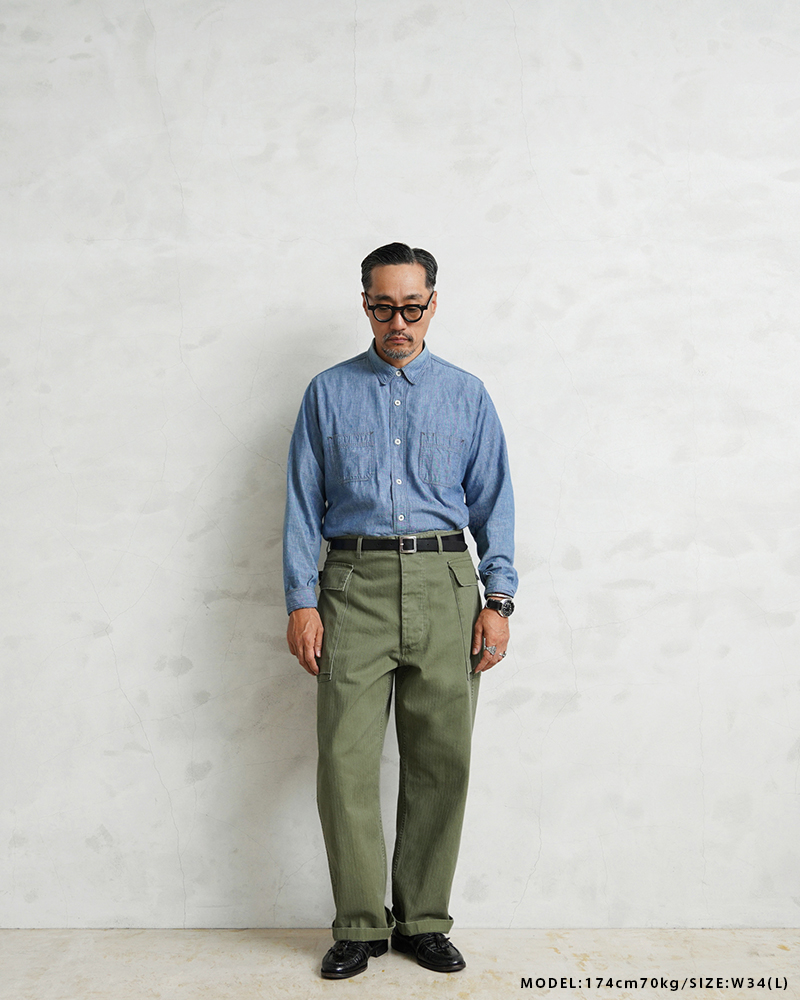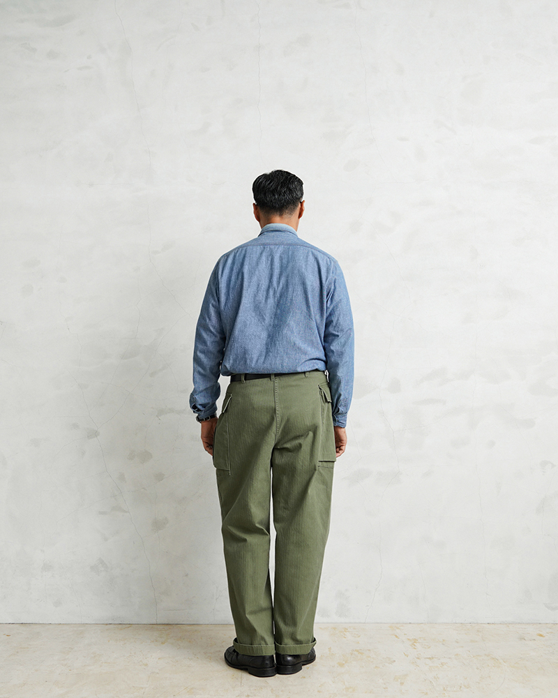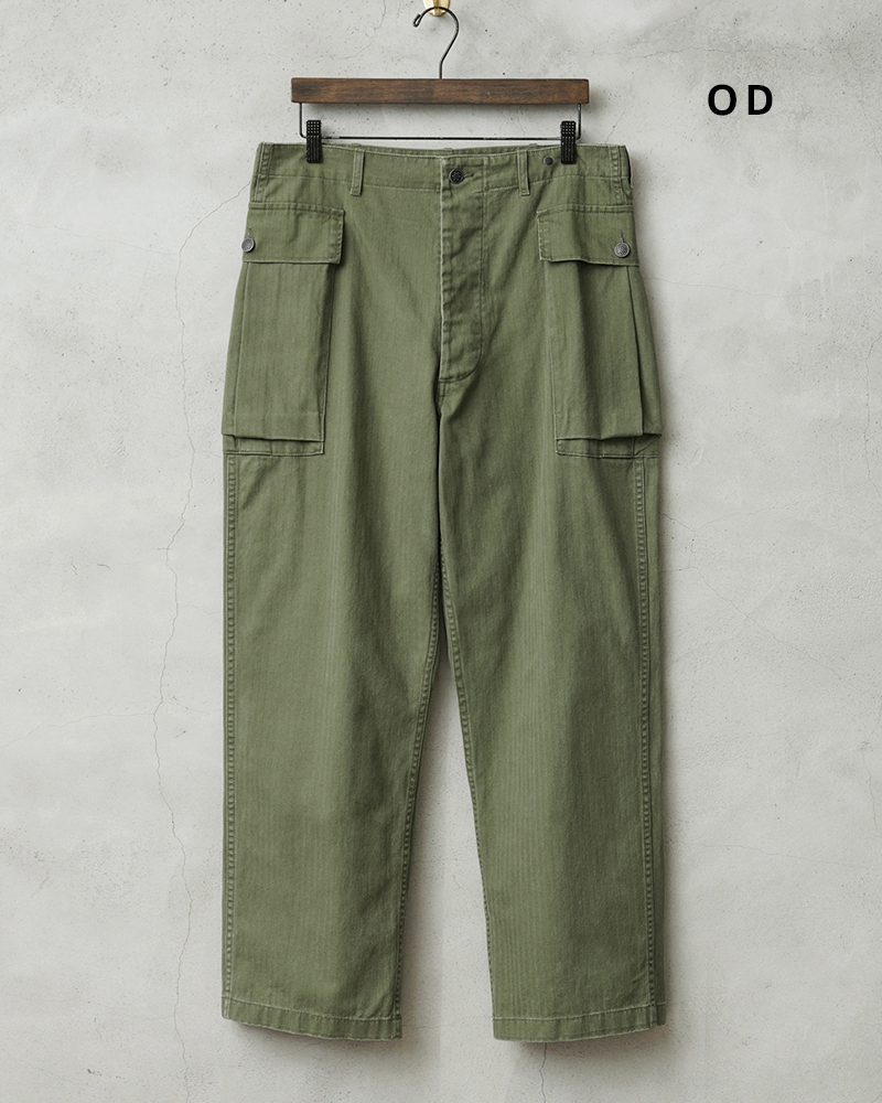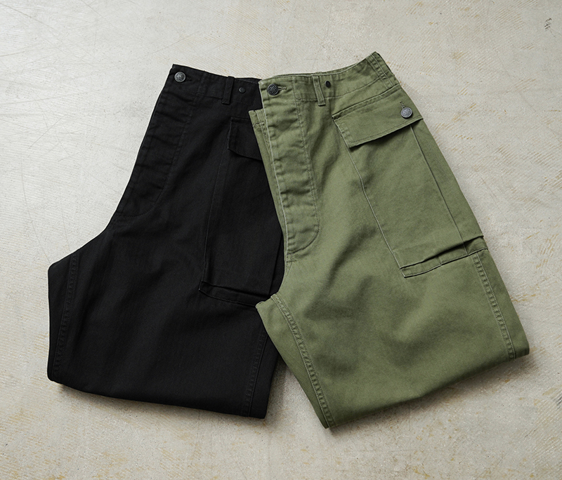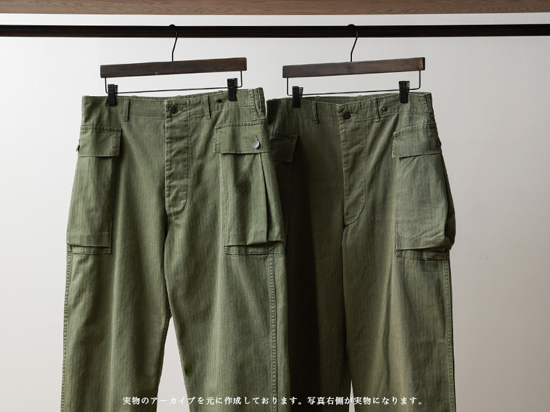 40年代のUS ARMYのHBTシリーズの中でも最も人気の高いM-43は、ジャケットと同様に大型のカーゴポケットを両サイドの腰部分に取り付けたユニークなデザインとなっています。