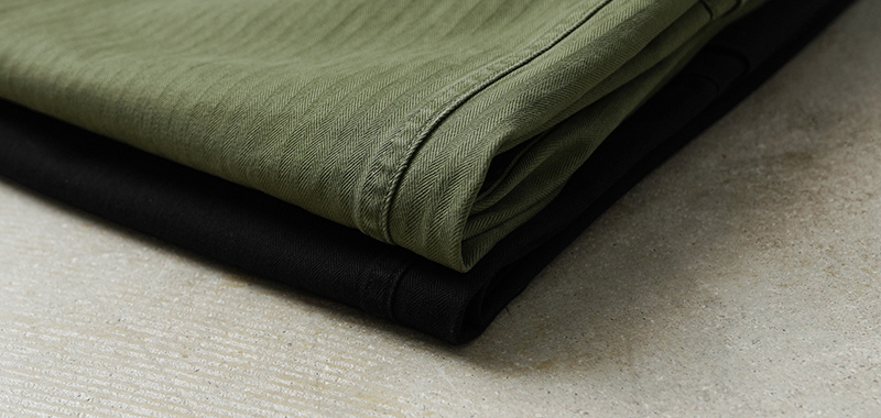 HBT=HERRING BONE TWILL(ヘリンボーンツイル)とは、ジグザグの織り目が特徴の素材で、この年代のアイテムに多く取り入れられました。名前の「ヘリンボーン」は、ニシン(herring)の骨(bone)のような見た目に由来し、矢羽根のようなV字型の模様が特徴です。