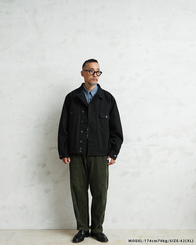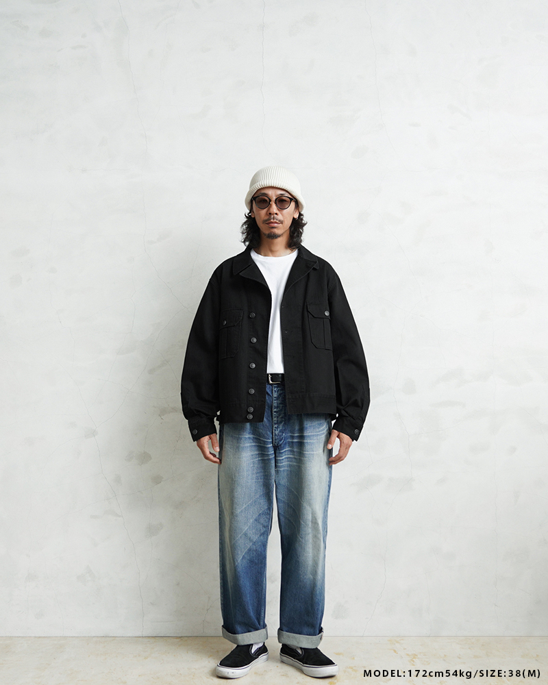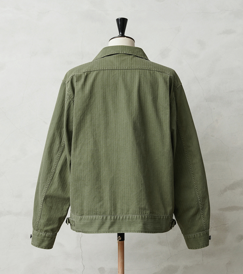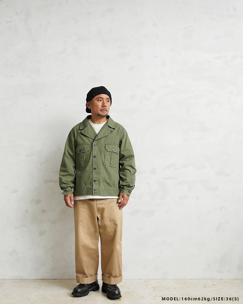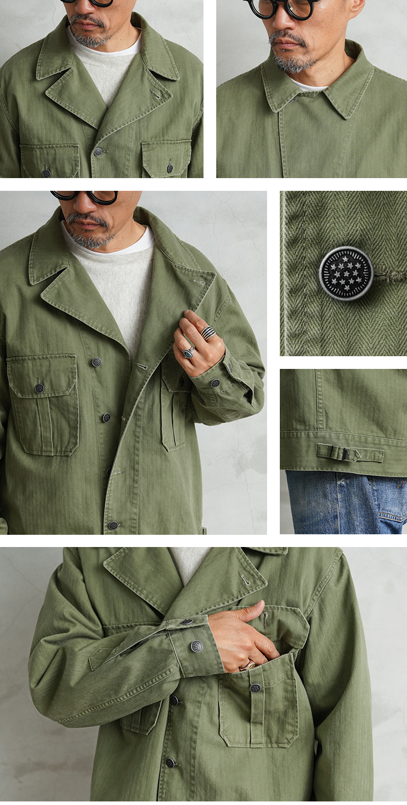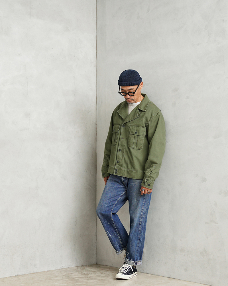 41~42年の短い期間に採用されたM-41は他の年代に比べ、裾のベルトや背面のヨーク使いがショート丈のトラッカージャケットに近いデザインとなっています。 袖口のカフスや両胸のフラップ付きのポケットなどワークウェアに通ずるデザインは近年非常に人気の高いデザインです。