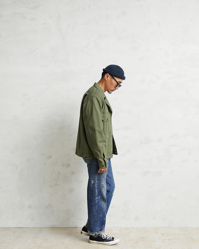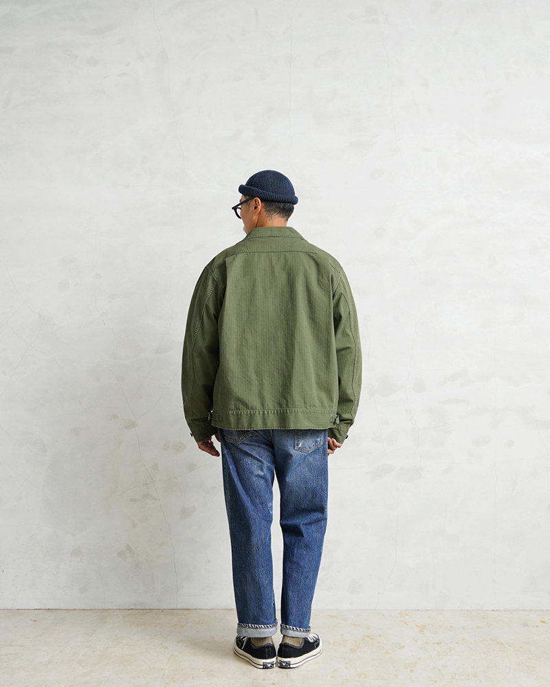 HBT=HERRING BONE TWILL(ヘリンボーンツイル)とは、ジグザグの織り目が特徴の素材で、この年代のアイテムに多く取り入れられました。名前の「ヘリンボーン」は、ニシン(herring)の骨(bone)のような見た目に由来し、矢羽根のようなV字型の模様が特徴です。