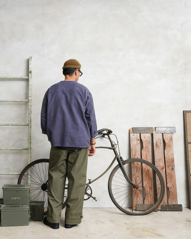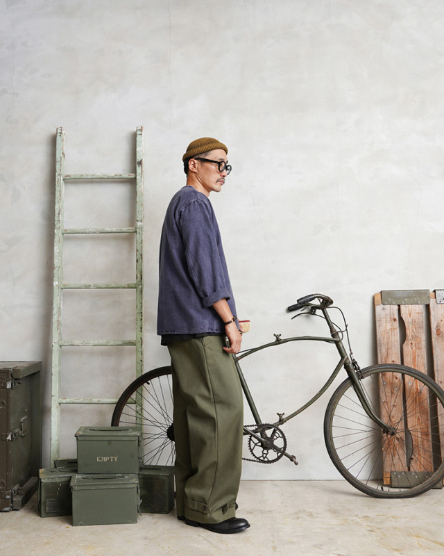 | 商品説明 | フランス軍 1940-50’s M-38 モーターサイクルパンツ ダブルニーモデル WAIPER.incのご紹介です。 品番:WP107 ヴィンテージアイテムとして探されている方も多く、希少価値の高い一本を密に織った風合いの良い厚手のコットンキャンバスを使用し忠実に再現しました。 表から見るとシンプルな印象ながら、風の侵入を防ぐために前開き部分は二重になっており、フィット感を高めるウエストと裾のベルトやバイクに跨った際に生地が擦れる部分は二重になっていたりと機能に基づいた各部のデザインも魅力となっています。 本来、オーバーパンツとして着用されていましたが、単体での着用を想定し、本来貫通式のポケットを通常のポケットにアレンジすることで普段使いしやすい一本になりました。 過酷な状況で使用されていたアイテムだけに放出される数も少なく、価格も高騰しているアイテムです。見事に復刻されたこちらのモーターサイクルパンツはWAIPER一押しのアイテムです! |