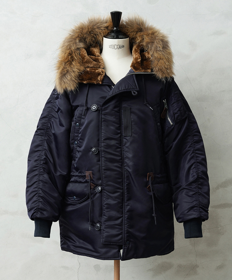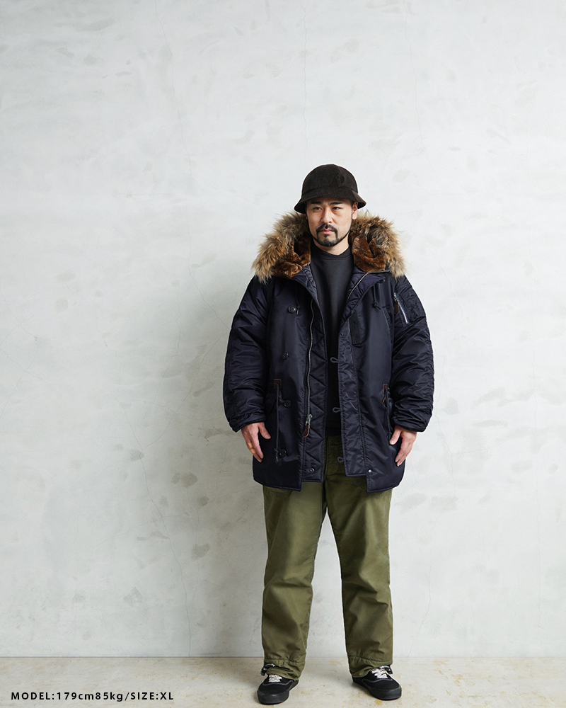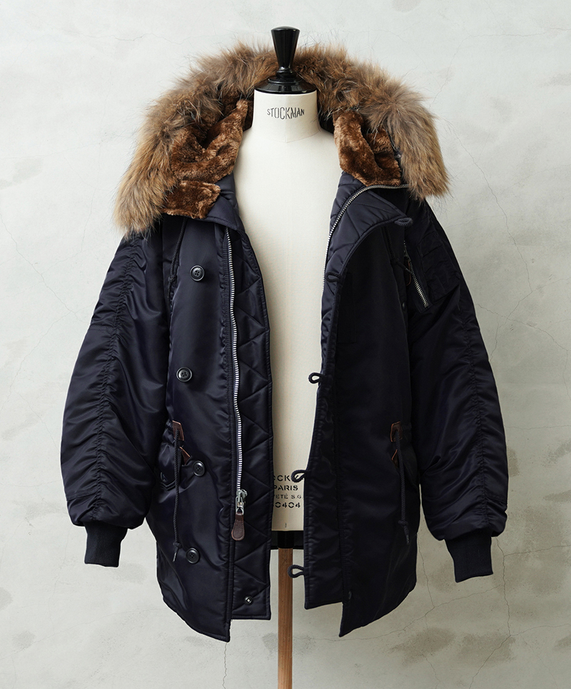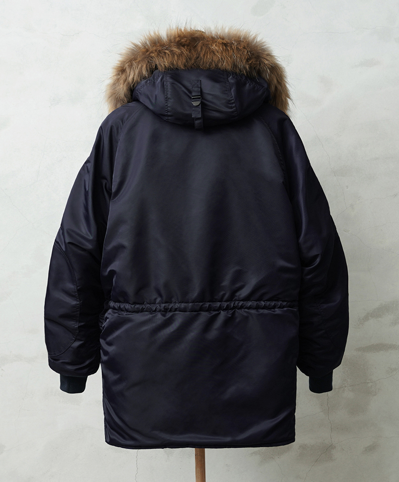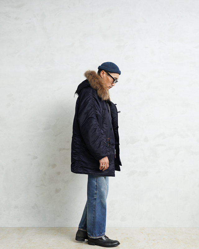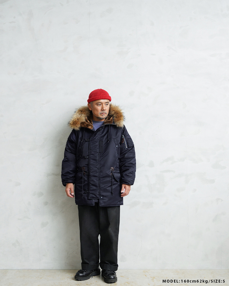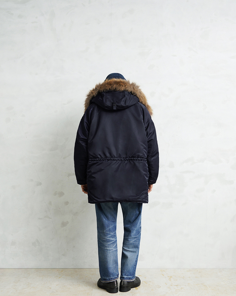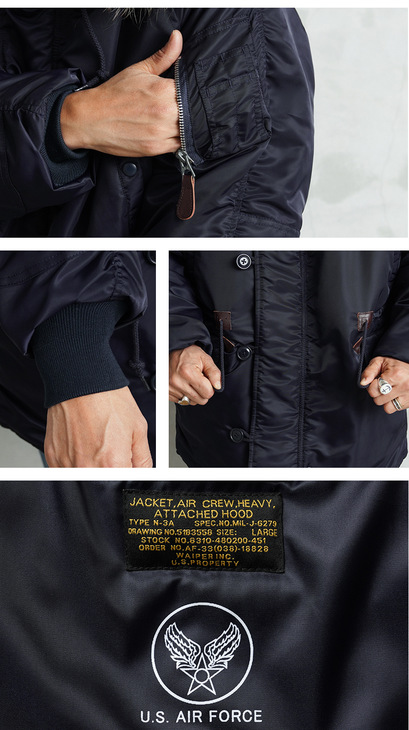| 商品説明 | WAIPER.inc 米軍 AIR CREW N-3A フライトジャケット リアルファー のご紹介です。 品番:WP148 品名:JACKET,AIR CREW,HEAVY,ATTACHED HOOD TYPE N-3A N-3Aは1950年代初頭、朝鮮戦争期の極寒地向けアウターとして米空軍に採用された、N-3の後継モデルです。N-3AはN-3の基本構造を受け継ぎつつ、エアフォースブルーの特徴的なネイビーカラーが特徴です。 当時の米空軍を象徴するエアフォースブルー(ネイビー)。N-3の落ち着いたODとは異なり、端正でクリーンな空軍らしい印象に仕上げられていました。 後のN-3Bへと続く“Nシリーズ進化の過渡期”を象徴する一着でもあります。 WAIPER.inc では、この希少なN-3Aを実物を基に忠実に再現し、現代的な着用感へとアップデートし完成させました。 N-3Bとの違いは顕著なところでは、裾付近まであるフロントの前立てフラップと、袖のリブがN-3Bのような隠しリブではなく、むき出しの袖口のデザインです。 同時期に採用されたライトゾーン向けのL-2Aフライトジャケットと同色になりますが、採用期間が極わずかだったこともありヴィンテージの中でも希少なカラーリングとなっています。 実物のシルエットを再現しつつ、肩回りのフィット感を調整することで着用した際の綺麗なシルエットを再現。ずっしりと重厚感のあるシルエットはしっかりと包み込まれる安心感があります。 フライトジャケットとしては、それまで採用されていなかったラグランスリーブを用いており、動きやすさが確保されているのも特徴。フードファーは上質な物のみを厳選した、非常にボリュームのあるラクーンファーを使用。 ラグランスリーブのアームにはパッカリングのギャザーが入ることで立体感のある仕上がりになっています。しっとりとした重みのあるナイロンの素材感とも相まって重厚な雰囲気を醸し出します。 圧倒的な防寒性も魅力の一つ。中綿がしっかりと詰まっており、保温性能については、もはや説明不要だと思います。 ナイロンの中綿アウターとは一味違う、ヘビーデューティーなN-3Bのルーツとも言えるフライトジャケットです。 |