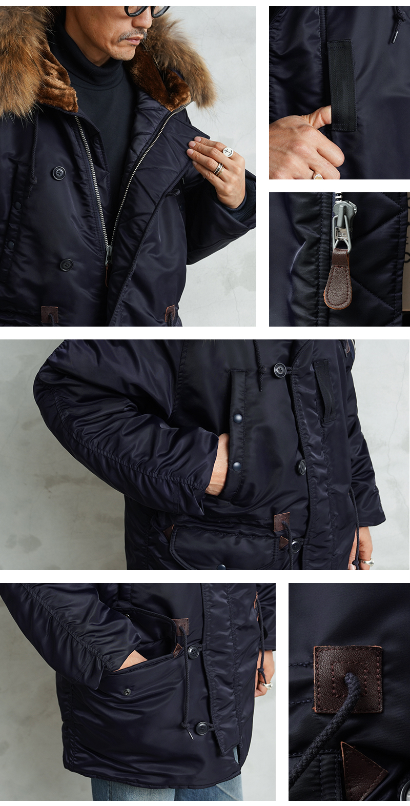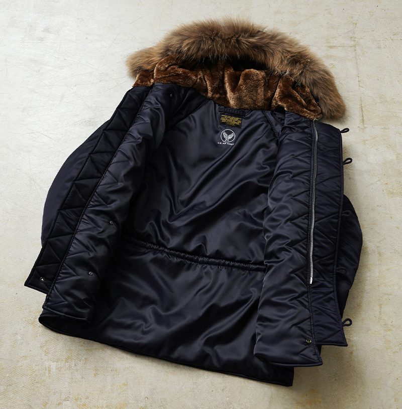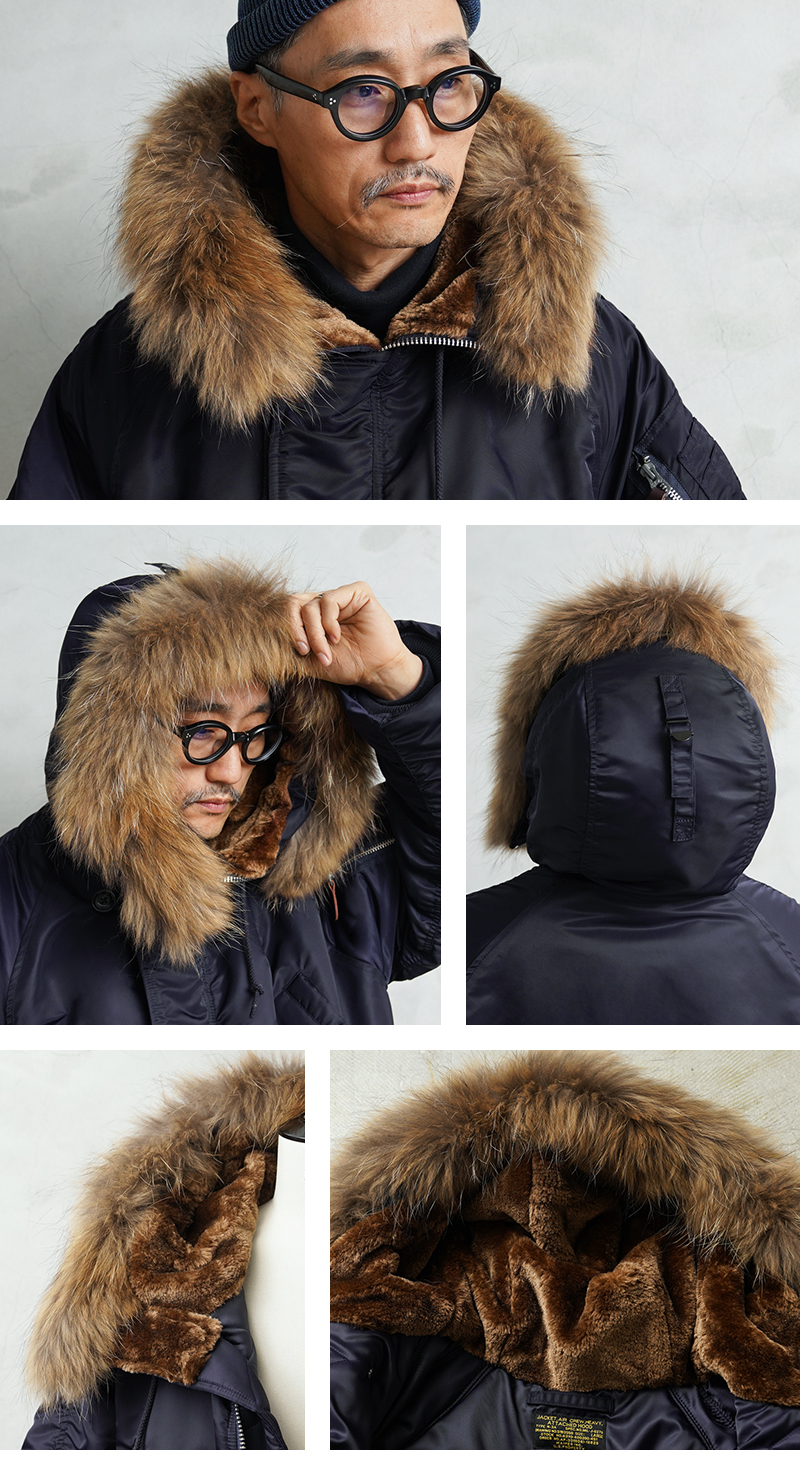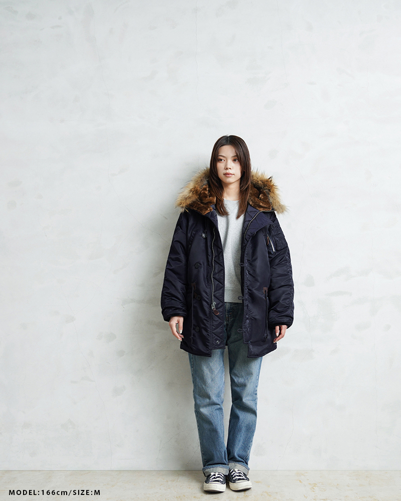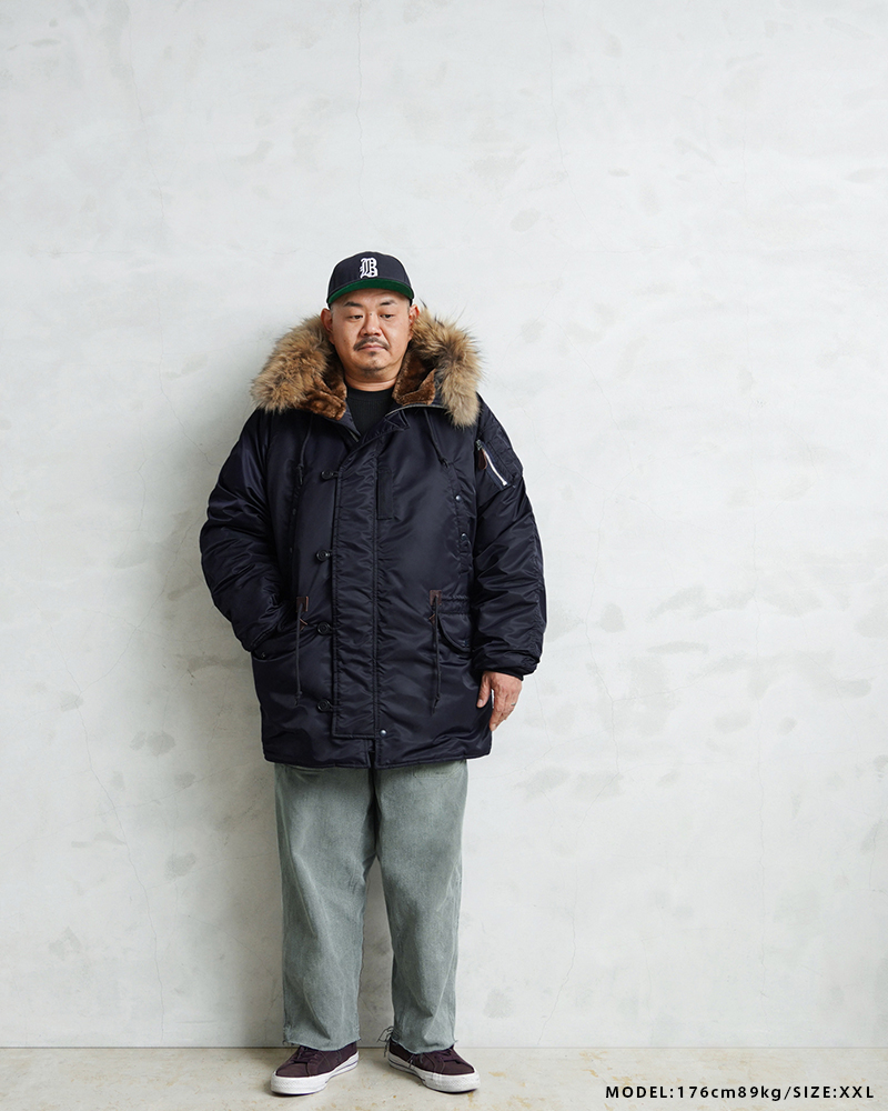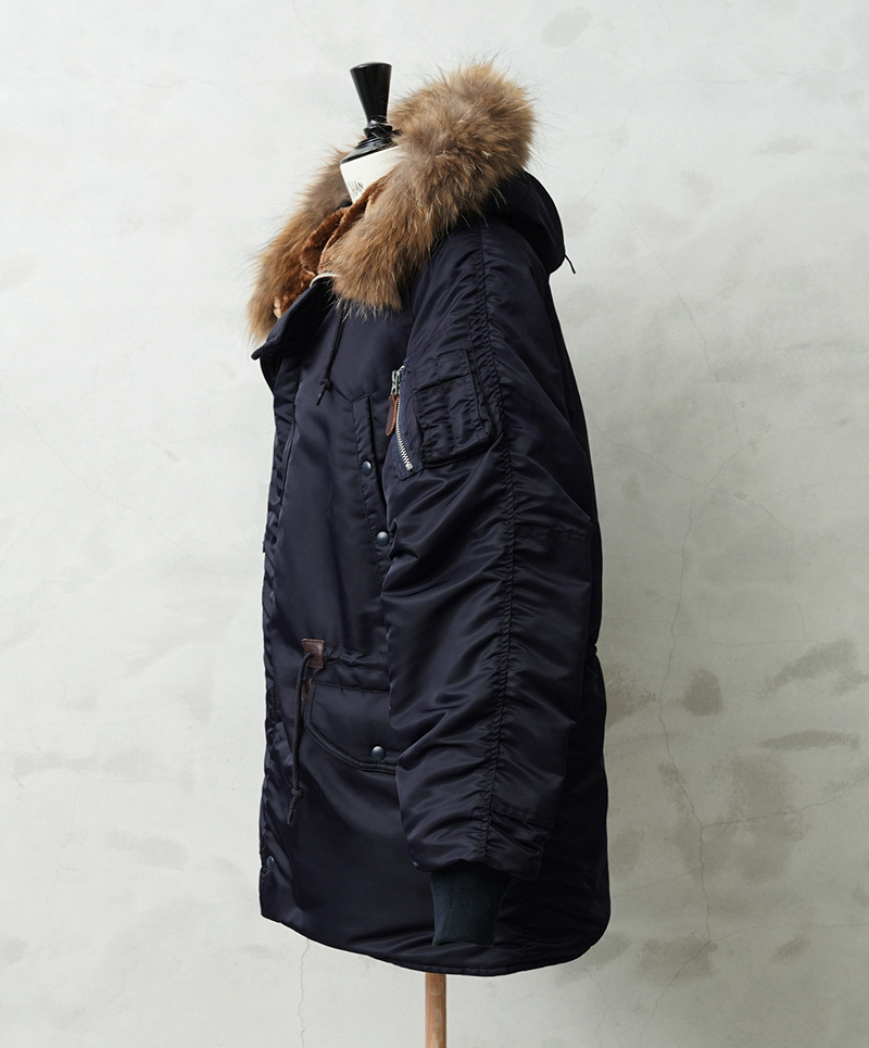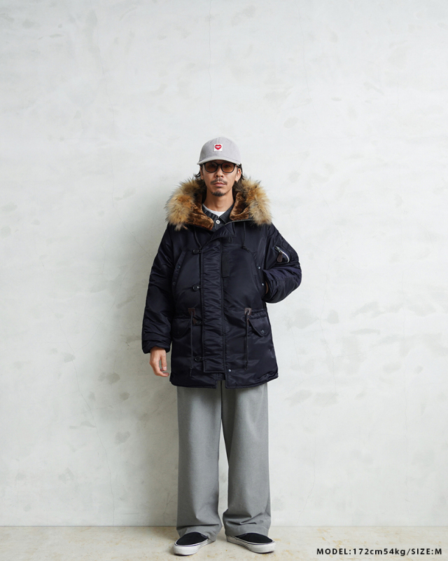 | 商品説明 | WAIPER.inc 米軍 AIR CREW N-3A フライトジャケット リアルファー のご紹介です。 品番:WP148 品名:JACKET,AIR CREW,HEAVY,ATTACHED HOOD TYPE N-3A N-3Aは1950年代初頭、朝鮮戦争期の極寒地向けアウターとして米空軍に採用された、N-3の後継モデルです。N-3AはN-3の基本構造を受け継ぎつつ、エアフォースブルーの特徴的なネイビーカラーが特徴です。 当時の米空軍を象徴するエアフォースブルー(ネイビー)。N-3の落ち着いたODとは異なり、端正でクリーンな空軍らしい印象に仕上げられていました。 後のN-3Bへと続く“Nシリーズ進化の過渡期”を象徴する一着でもあります。 WAIPER.inc では、この希少なN-3Aを実物を基に忠実に再現し、現代的な着用感へとアップデートし完成させました。 N-3Bとの違いは顕著なところでは、裾付近まであるフロントの前立てフラップと、袖のリブがN-3Bのような隠しリブではなく、むき出しの袖口のデザインです。 同時期に採用されたライトゾーン向けのL-2Aフライトジャケットと同色になりますが、採用期間が極わずかだったこともありヴィンテージの中でも希少なカラーリングとなっています。 実物のシルエットを再現しつつ、肩回りのフィット感を調整することで着用した際の綺麗なシルエットを再現。ずっしりと重厚感のあるシルエットはしっかりと包み込まれる安心感があります。 フライトジャケットとしては、それまで採用されていなかったラグランスリーブを用いており、動きやすさが確保されているのも特徴。フードファーは上質な物のみを厳選した、非常にボリュームのあるラクーンファーを使用。 ラグランスリーブのアームにはパッカリングのギャザーが入ることで立体感のある仕上がりになっています。しっとりとした重みのあるナイロンの素材感とも相まって重厚な雰囲気を醸し出します。 圧倒的な防寒性も魅力の一つ。中綿がしっかりと詰まっており、保温性能については、もはや説明不要だと思います。 ナイロンの中綿アウターとは一味違う、ヘビーデューティーなN-3Bのルーツとも言えるフライトジャケットです。 |