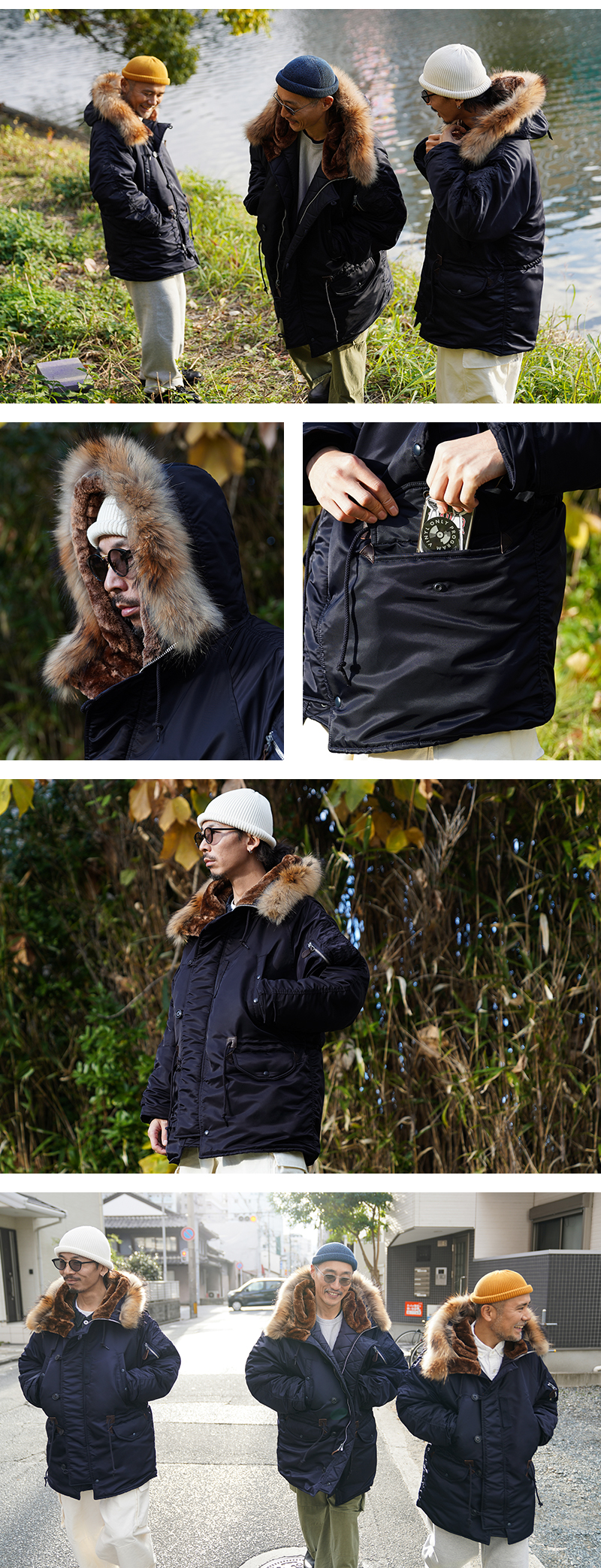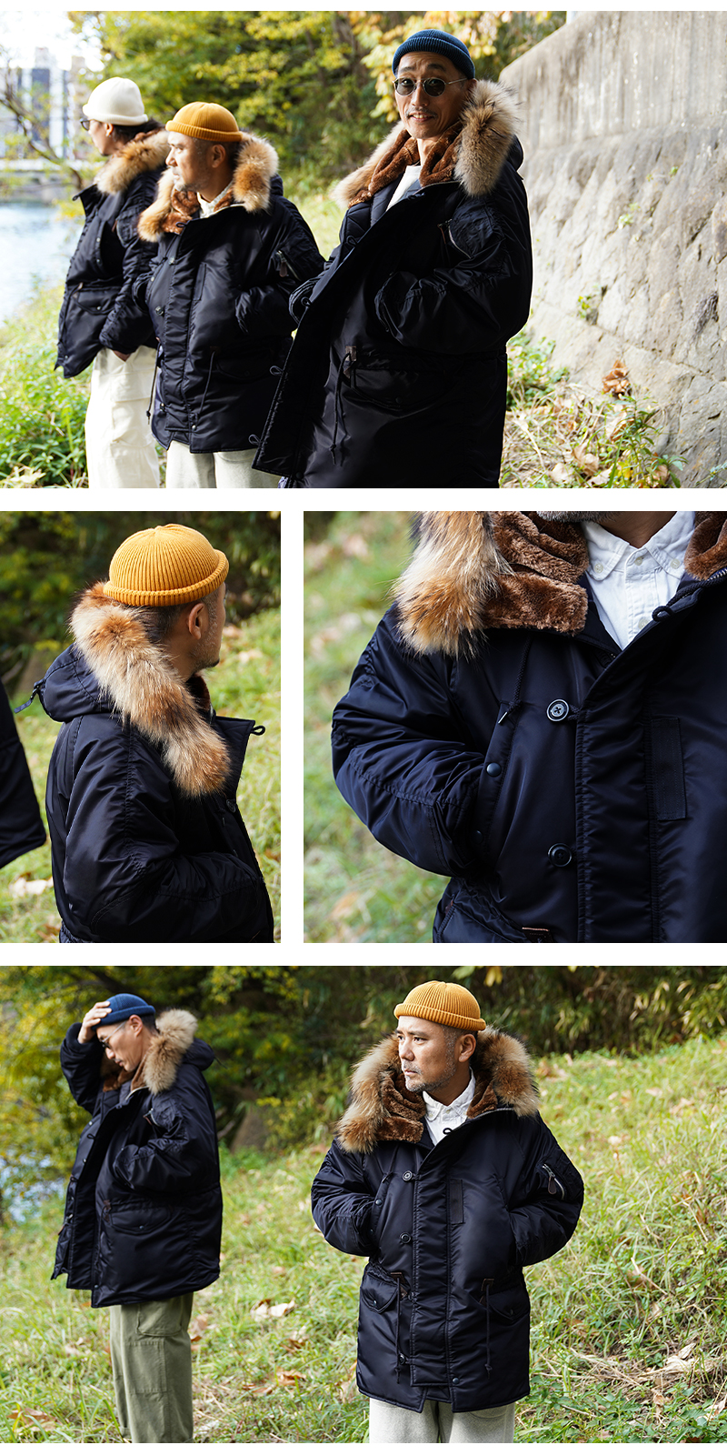 | 素材 | 表地:ナイロン100% 裏地:ポリエステル100% 詰め物:ポリエステル100% 別布:綿100% フード裏部分:ポリエステル100% ファー部分:チャイニーズラクーン リブ部分:アクリル95%、ポリウレタン5% |