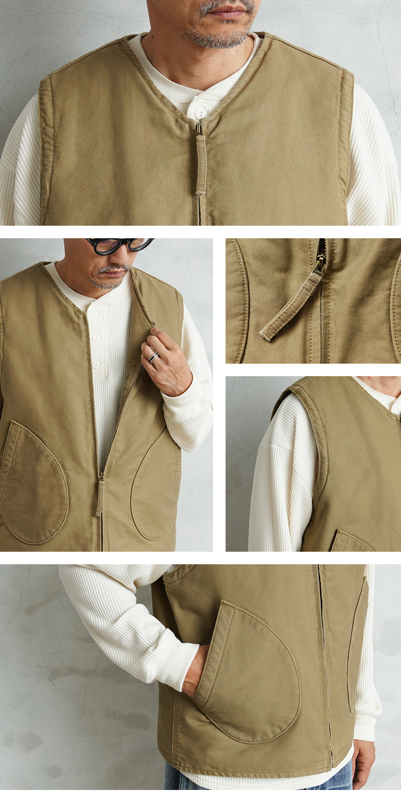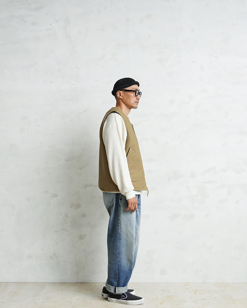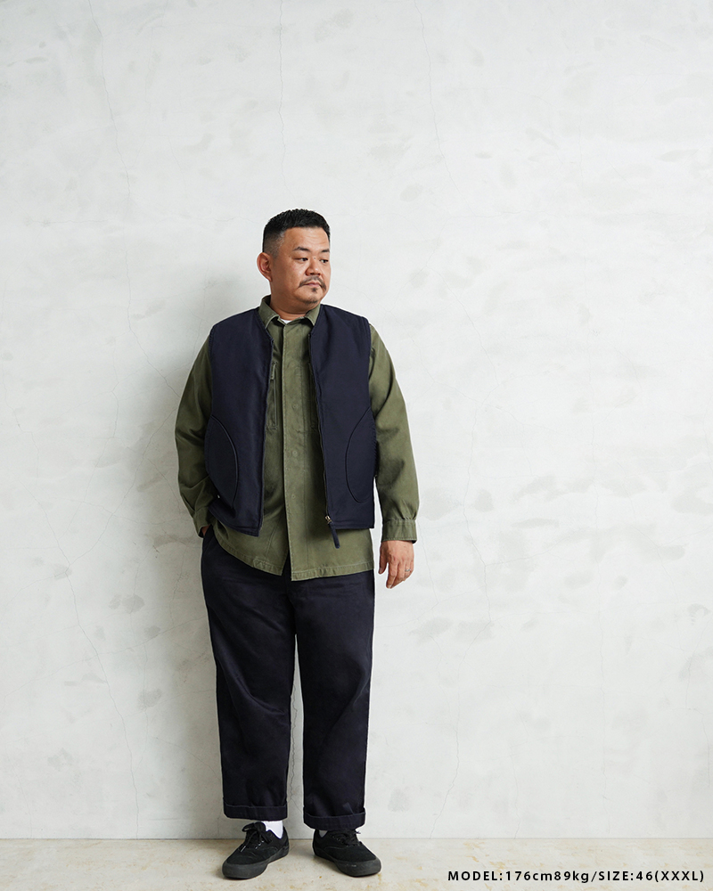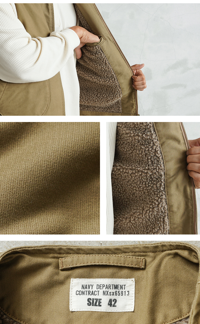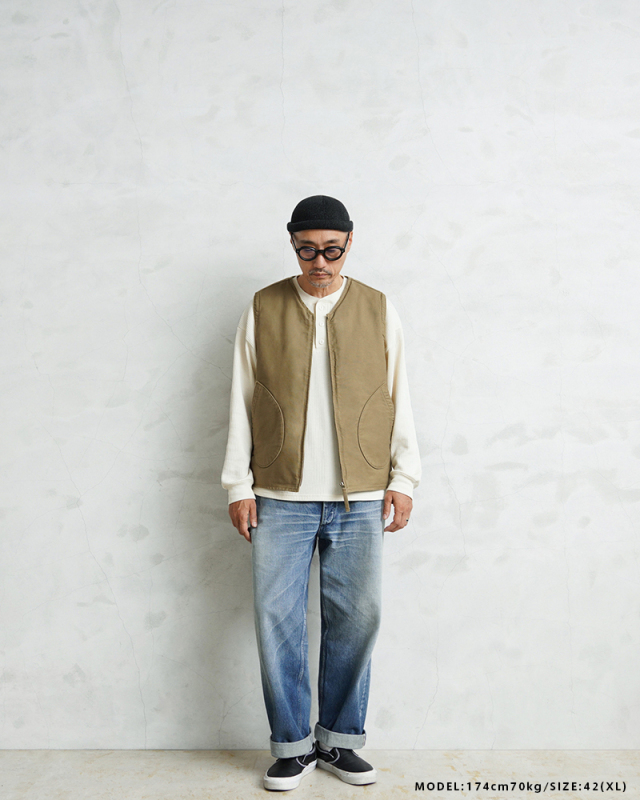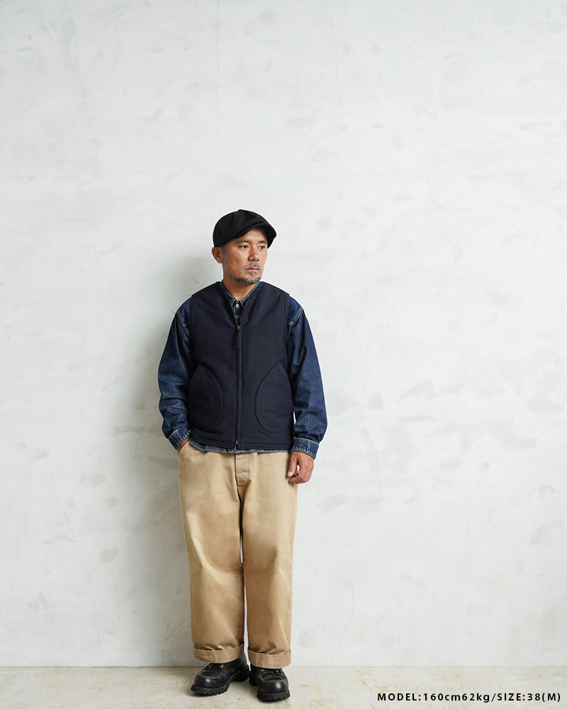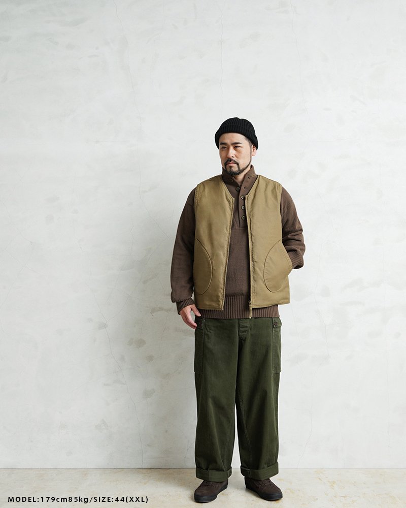 | 商品説明 | WAIPER.inc 米海軍 U.S.NAVY N-1 デッキベスト のご紹介です。 制式名称:N-1 DECK JACKET 品番:WP29 米海軍(U.S.NAVY)が生んだ傑作として名高い「N-1デッキジャケット」。 同じ素材を用いた40年代に存在したベストを製作しました。 デッキベストという名が示すとおり、アメリカ海軍の甲板作業用として採用されたミリタリーウェア。 N-1と同様に冬の海上における猛烈な寒さに耐えられるようにデザインされた堅牢な素材はタフな生地と防寒性を両立します。 表地にはジャングルクロスと呼ばれる高密度に織られたコットンファブリックを採用。着こむほどに体に馴染む風合いが魅力です。 防寒性に優れたライニングはアルパカを数年着込んだような、ボアフリースを使用。肌触りもよく、ウール特有のチクチク感が無く直接肌に触れても気持ちの良い着心地となっています。 アウターを着るにはまだ早いが寒さが気になるときに重宝するベストはネルシャツやサーマルの上からシンプルに合わせるもよし、レザーや薄手のジャケットなどに保温性を加えるレイヤードもおすすめです。 デニムやチノパンなど定番のボトムスとも相性抜群なので、普段の着こなしに羽織るだけでサマになるベストとなっています。 |