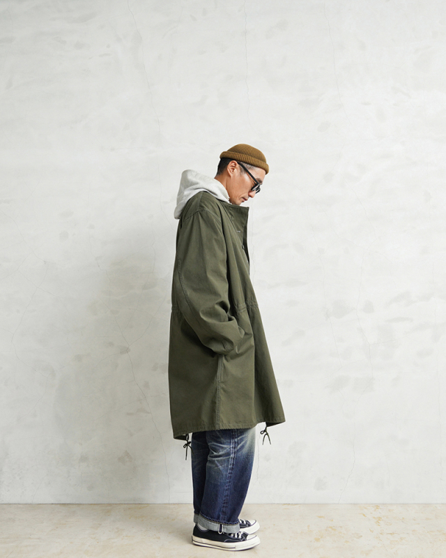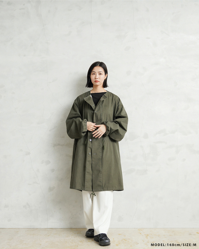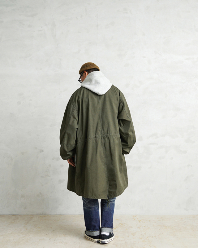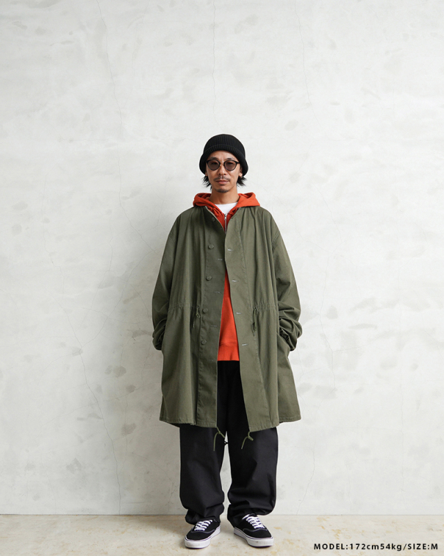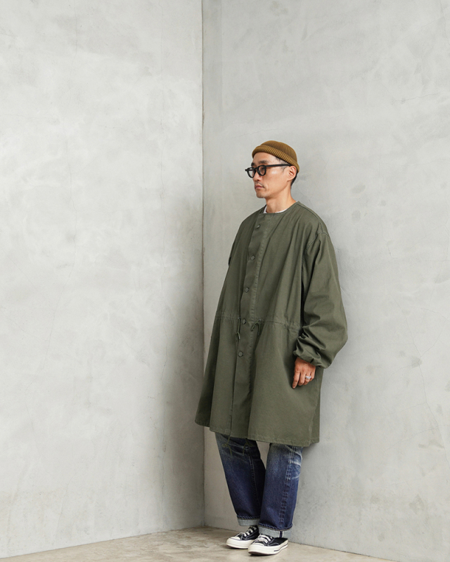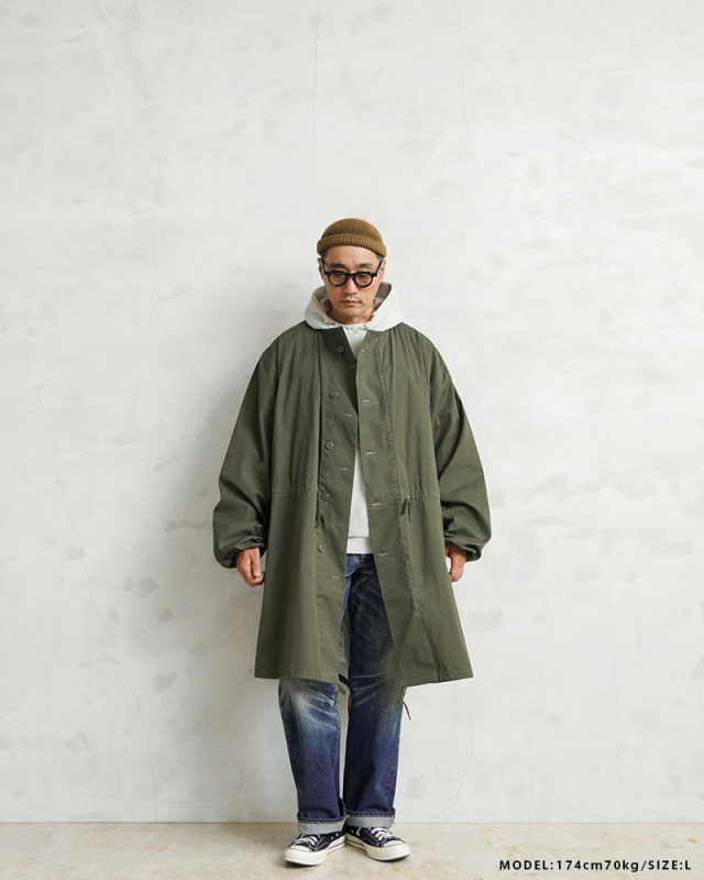 | 商品説明 | 米軍 1960’s U.S.ARMY VESICANT ガスプロテクティブコート WAIPER.inc のご紹介です。 品名:COAT,MAN’S CTN SHEETING,SPECIAL FOR IMPREGNATION 品番:WP68 米軍にて1960年代ごろに採用されていたガスプロテクトコートを復刻再現。 M-51パーカ、M-65モッズコートなどフィッシュテールタイプのシェルを彷彿とさせるシルエット。実物をサンプリングし、質感、シルエット共にいい感じに仕上がりました。実物でも非常に放出の少ないアイテムで、王道のミリタリージャケット・ミリタリーコートとはまた違ったアジのある存在です。 ノーカラーの首周り、ゆったりとした余裕あるシルエットで、メンズでもレディースでも着られる一着。ウエストはドローコード付きですので、お好みのシルエットにアレンジできちゃいます。M-65モッズコートをシェルオンリーで着たり、ライナーコートがお好きな方には特にハマるアイテムではないでしょうか。 本来はポケットがないデザインなのですが、デザインを邪魔しないよう両サイドにシームポケットを配置。見た目は忠実に、それでいてアウターとしても使いやすく仕上げています。 |