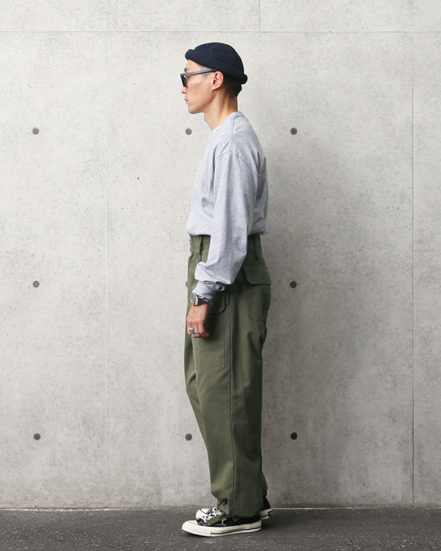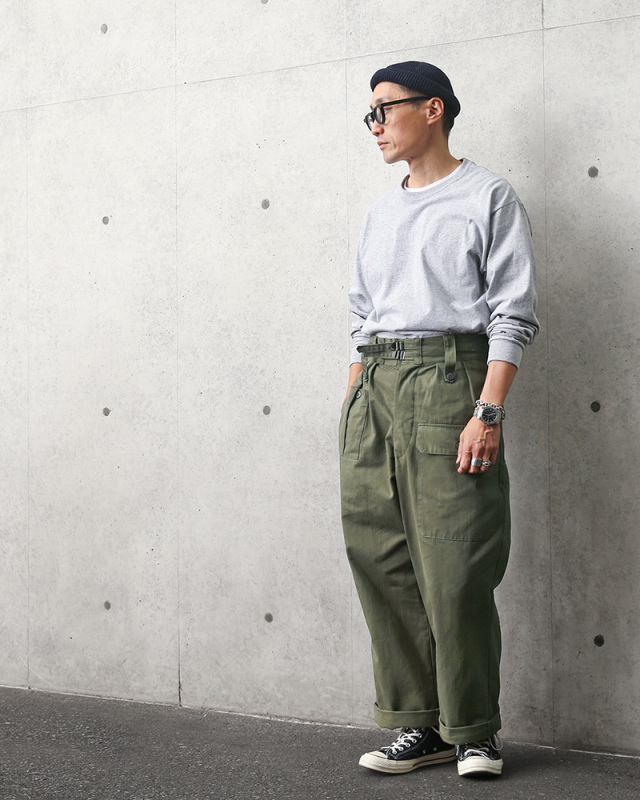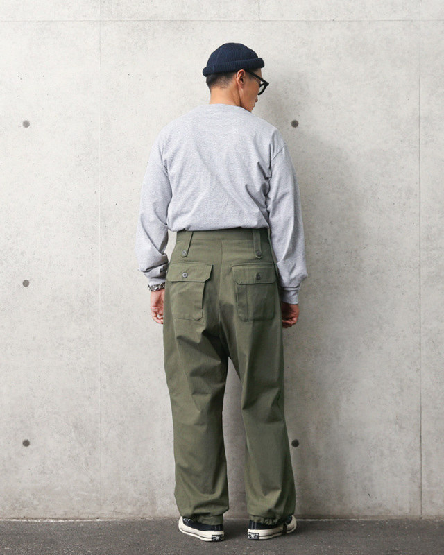 | 商品説明 | イギリス軍 HBT ジャングル トラウザーズ WAR AID WAIPER.incのご紹介です。 品名:TROUSERS JUNGLE,W.A. 品番:WP94 第二次世界大戦中にアメリカ軍が自国で使用されていたHBT(ヘリンボーンツイル)の生地などを使用し、イギリス軍への援助のためにイギリス軍で採用されていたバトルドレス トラウザーズを製造したという珍しいエピソードを持つパンツをWAIPER.incで復刻しました! ウエストの特徴的なダブルバックルのウエストベルトやボタンフライの内側には「GAS FLAP」のプリントなども忠実に復刻。タグには「TROUSERS JUNGLE,W.A.」と記されており、W.A.はWAR AIDの略語で他国を支援するために作られたアイテムを意味します。 1941年から1945年にかけて、アメリカ合衆国が連合国に対してレンドリース法、または武器貸与法(ぶきたいよほう)により膨大な量の軍需物資を供給するプログラムの1つとしてこちらのジャングル トラウザーズも製造されイギリス軍に供給されました。 フロントの大きなフラップ付きマップポケットに加え、サイドポケットやバックポケットも備わっていますのでカーゴパンツと同様に収納力にも優れています。 ストレートシルエットなのでゆったりとしたリラックスフィットで着用いただけます。裾はドローコードで絞れますし、ロールアップしての着用もおすすめのヴィンテージライクなトラウザーズです。 |
