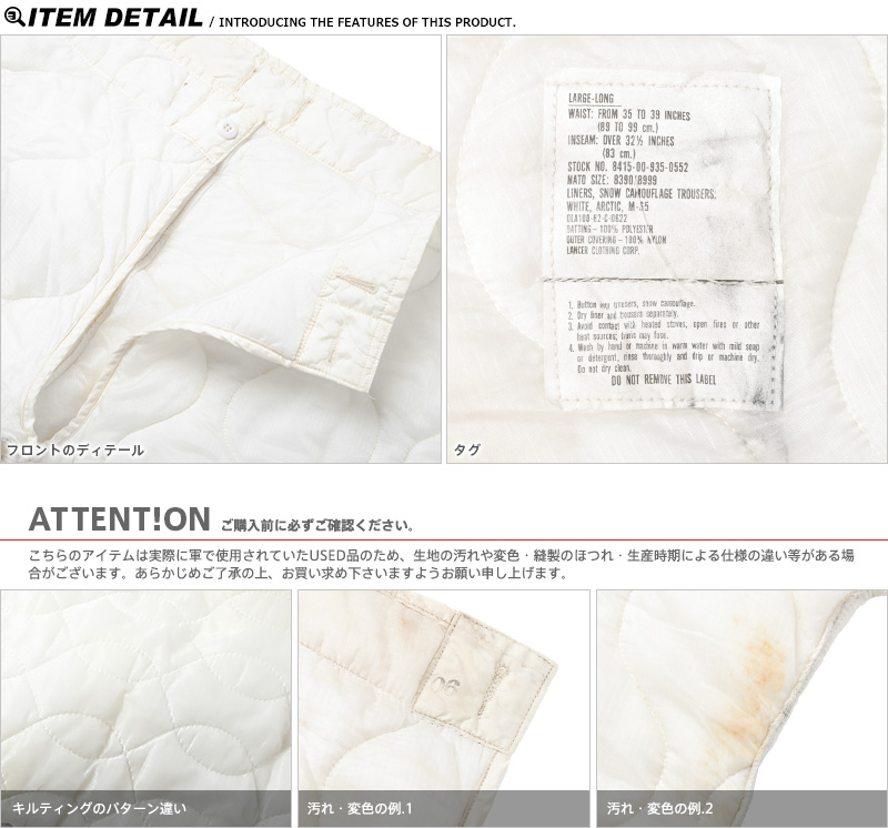 軍放出のUSED ※こちらのアイテムは実際に軍で使用されていたUSED品のため、生地の汚れや変色・縫製のほつれ等がある場合がございます。また、入荷時期により細部の仕様やタグの位置が異なる場合がございます。あらかじめご了承の上、お買い求め下さいますようお願い申し上げます。