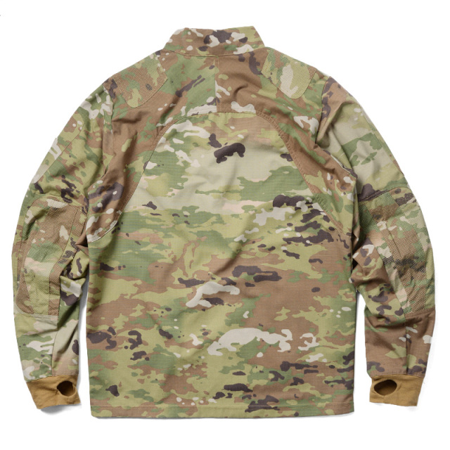 伸縮性がある一般的なコンバットシャツと異なりアラミド繊維が混紡された少し厚みがある質感です。火に強く、燃えにくい素材で、リップストップで裂けにくく、多少の雨ならはじきます。吸湿性の快適さも兼ね備えていて、体にフィットします。理想的なコンバットシャツだと思います。肘、肩は補強され、袖先にはフィンガーホールが設けられています。両袖はポケット付きで、5×5cmのベルクロパネル付きで階級章等のパッチ貼りにちょうど良いサイズです。非常に流通の少ないアイテムです。
