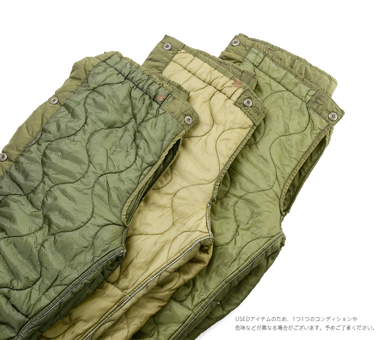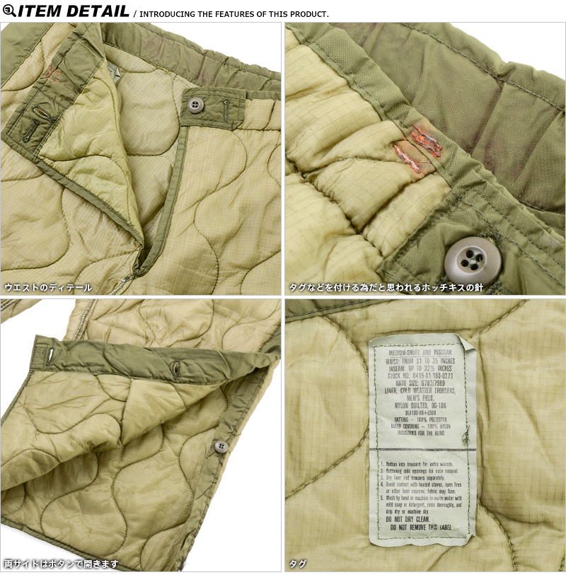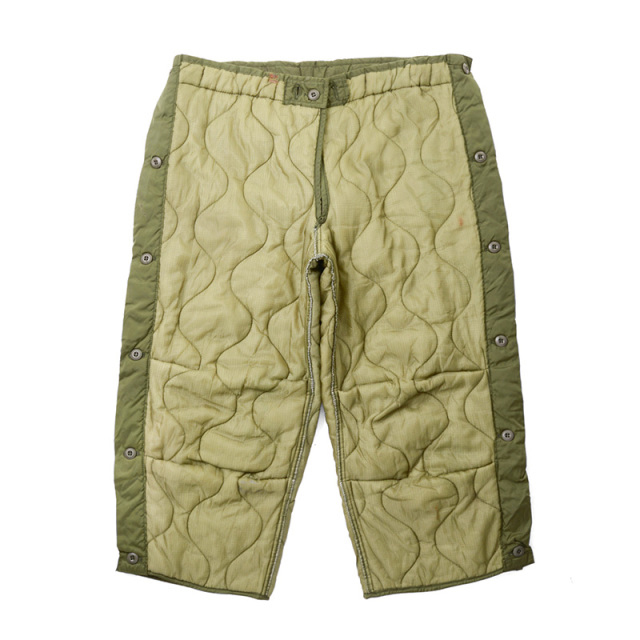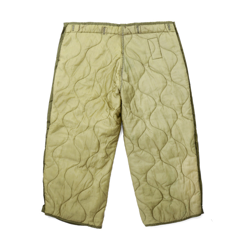 米軍より放出されたM-65フィールドパンツ用のキルティングライナーです。M-65フィールドパンツはこのライナーを装着する事により、防寒衣料としての100%の性能を発揮します。両サイドから開く事ができるサイドボタンタイプとなっています。