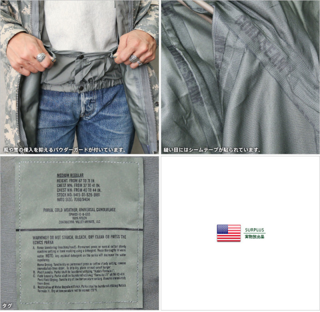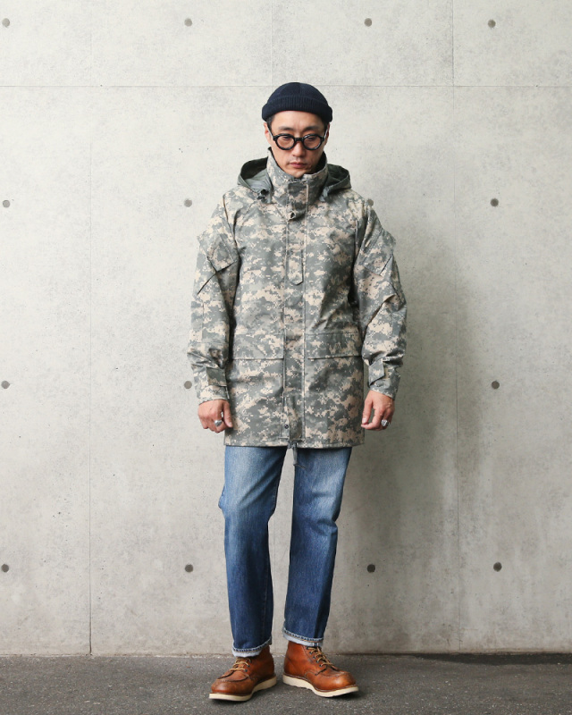 | 商品説明 | 実物 新品 デッドストック 米軍 ECWCS 2nd Gen GORE-TEX パーカ ACU(UCP) のご紹介です。 制式名称:PARKA,COLD WEATHER UNIVERSAL CAMOUFLAGE 防水性と透湿性を兼ね備えたGORE-TEX素材を採用した2nd GenerationのECWCSパーカです。 フードが襟に収納出来る「海兵隊仕様」となっており、急な天候の変化にも柔軟に対応可能。脇下のベンチレーションジップを開くことにより、パーカを着たままで体温調節を行えます。 肘の部分は補強されており、摩擦への耐性も抜群!ボディの左右に設けられたポケットは縦からも横からも手を入れられる構造に。フロントジップの横にはベルクロタイプの隠しポケットが設けられています。左右の上腕にもフラップポケットが設けられており、収納力も申し分ありません。 シェルに採用されているGORE-TEXファブリックは、雨や霧など外側からの水の侵入を防ぎつつ、身体から発せられる余分な水分を外部へと放出する機能を備えています。防風性にも優れているので、インナーにフリースを合わせることで更に保温性を高める事が可能に。夏はレインウェア、春秋は軽く羽織れるライトアウター、冬はインナーを着込むことでオールシーズンで活躍できます。デニムはもちろんカーゴパンツとの相性も良く、幅広く活躍してくれる一着。 2010年11月の調達を最後に、米国政府による新規調達は行われておらず、次第に希少性が高まっていくと思われるアイテムです。この機会にどうぞお試しください。 ECWCS(EXTENDED COLD WEATHER CLOTHING SYSTEM)とは 1980年代後半に米軍において制式採用された極寒冷気候向けのレイヤリングシステムで、拡張式寒冷地被服システムと呼ばれています。パーカの他に化繊のインナーウエアー/ライナーを活動地域の気候に合わせて組み替えるシステムとなっており、それまでのM-65パーカのような防寒性のみを追求したものから、組み合わせにより様々な気候に対応できる画期的な被服システムへと発展しました。 ※商品は同一でも製造メーカーの違いで、GORE-TEXの表記がない、ジッパーのメーカーが異なるなど仕様に違いがある場合がございます。予めご了承ください。 |