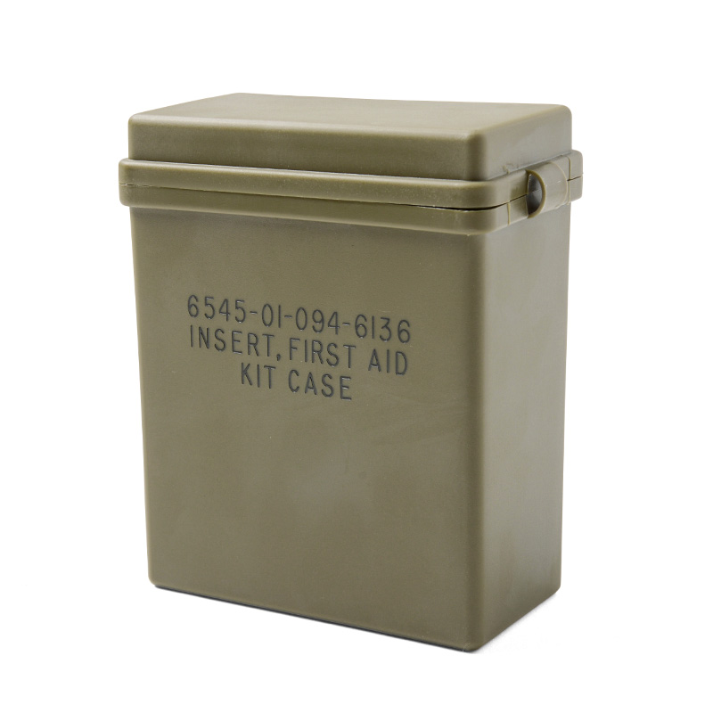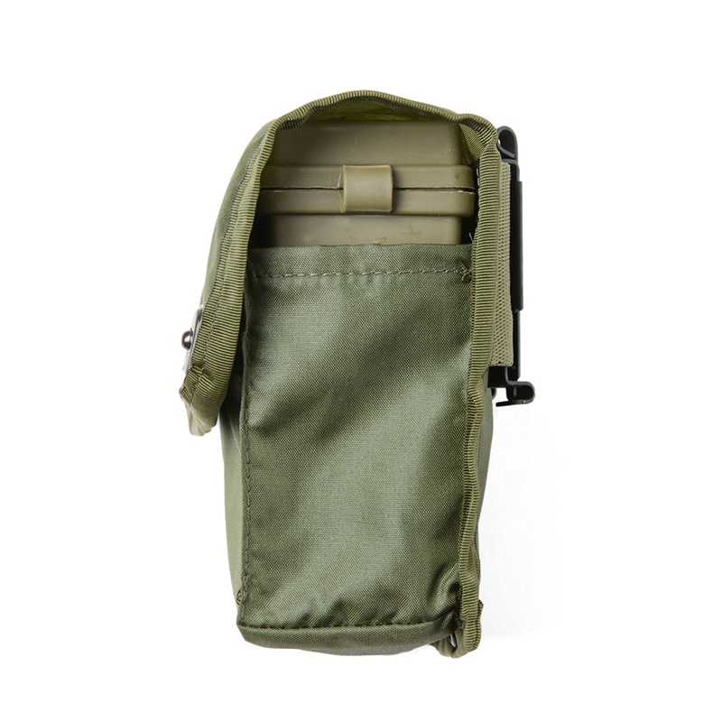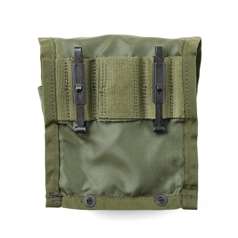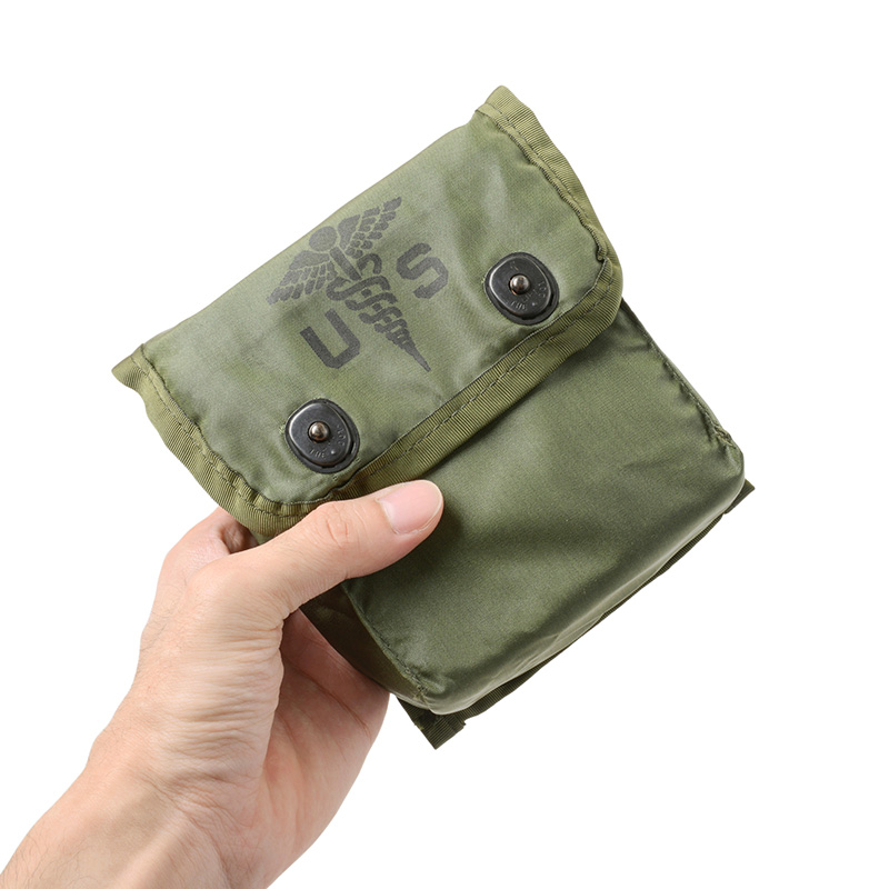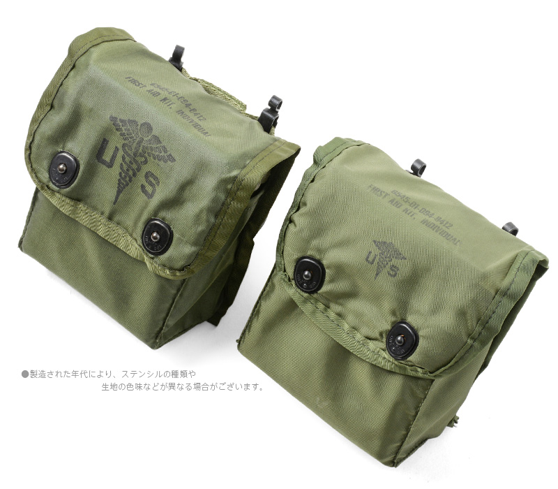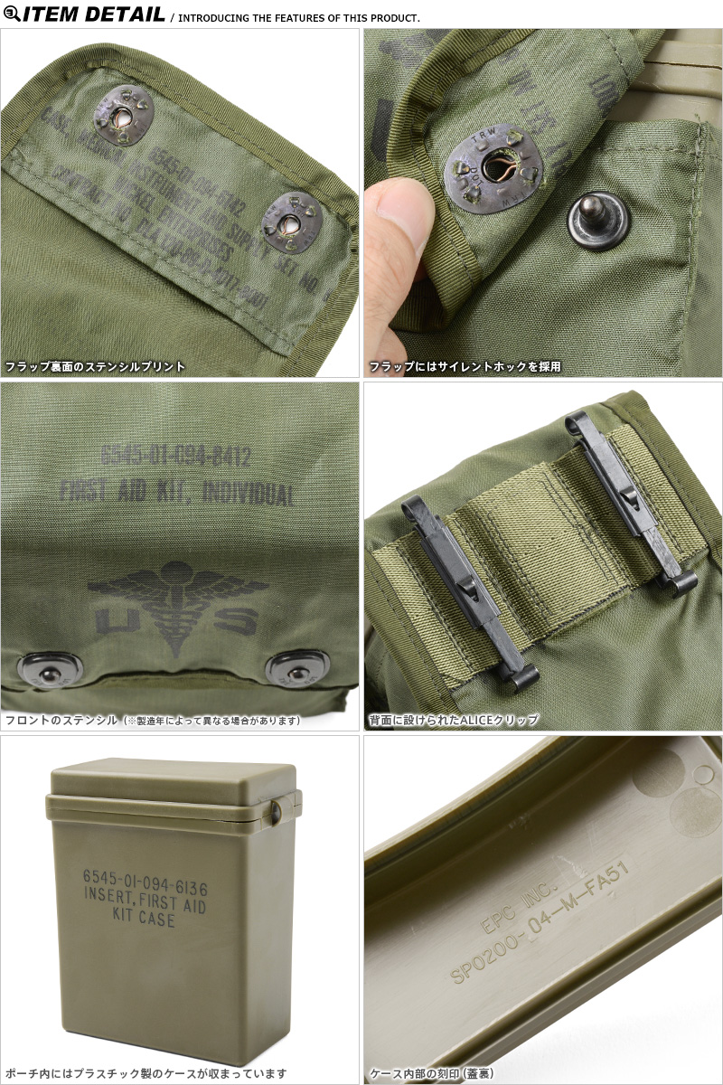 米軍において採用されている個人用のファーストエイドキットケースです。1973年より導入されたALICE装備に装着する際に必要な、ナイロン製のカバーが付属します。カバー背面には2本のALICEクリップ(スライドキーパー)が取り付けられており、ALICE装備のピストルベルトやバックパックなどに装着可能。使用されているナイロンファブリックには撥水性が備わっています。コレクションとしては勿論、洗面用具や工具など小物収納にも便利です。