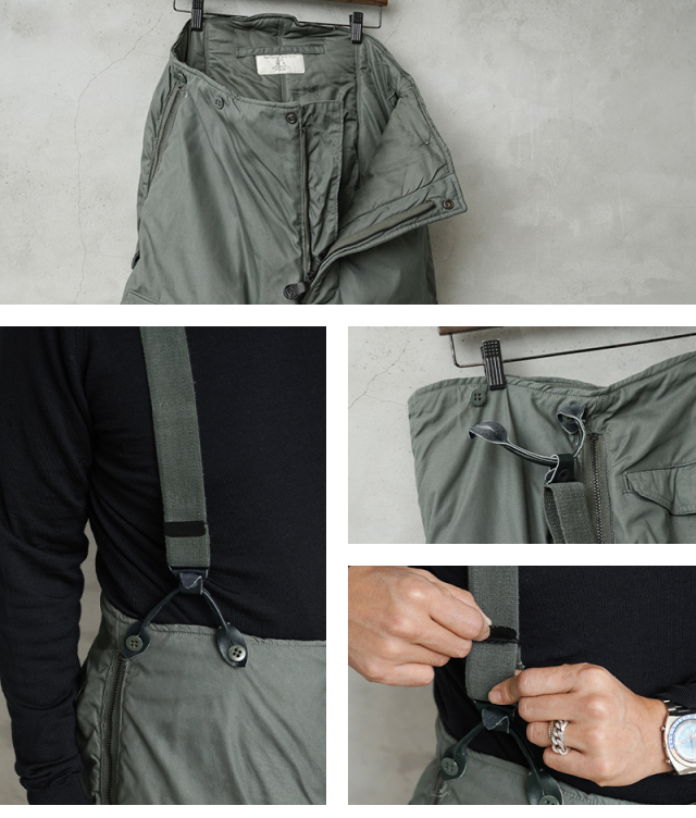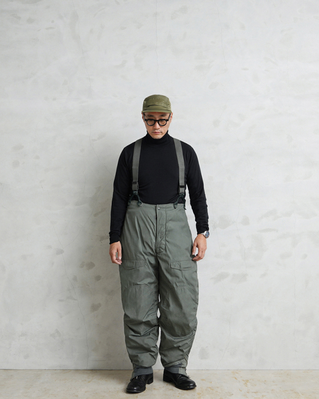 | 商品説明 | 実物 USED 米軍 U.S.A.F. F-1B フライトパンツのご紹介です。 制式名称:TROUSERS,E.C.W.,TYPE F-1B N-3Bの下に合わせるモデルとしても有名な、米空軍で使用されている防寒オーバーパンツです。見た目通り重量感たっぷりでとても高い保温力を誇ります。 ウエストはサスペンダーで吊るす方式。裾はリブ仕様になっており足下からの冷気を防ぐと同時に、サイドのジッパーにより防寒ブーツなどの着脱も容易となっております。サイドのポケットはオーバーパンツのため中のパンツにアクセス出来るよう貫通式になります。 耐久性が非常に優れたミルスペック金属ジッパー、グローブ着用のまま大丈夫な大型のジッパータブを採用など過酷な着用場面を想定した堅牢なつくりになっています。 サスペンダー付きの中綿入りのオーバーパンツということで防寒性は抜群!パンツのシルエット自体も良いため、バイクに乗る時などの防寒性を高めたいときのファッションとしてもおすすめです。 優れた機能性・ディテール・デザイン性はバイカー、アウトドア、フィッシングなど様々な場面で活躍できますので1本持っておくと心強いアイテムです。希少な放出ですのでこの機会に是非どうぞ。 |
