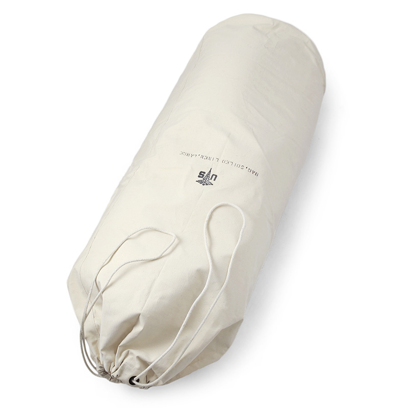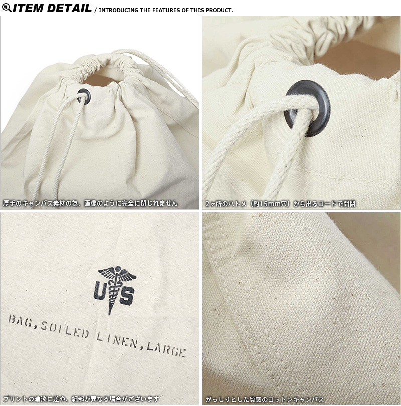 2ヶ所のハトメから出たロープで開閉を行えます。BAG,SOILED LINEN,LARGEのステンシルもGOODなデザイン。ダッフルバッグ感覚でご使用頂くことはもちろん可能ですし、エプロンやトートバッグなどアイデア次第でオリジナルアイテムを完成させるマテリアルとしても人気です。