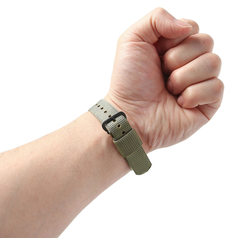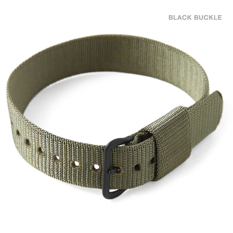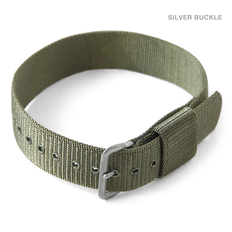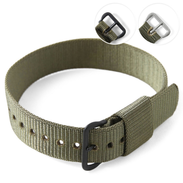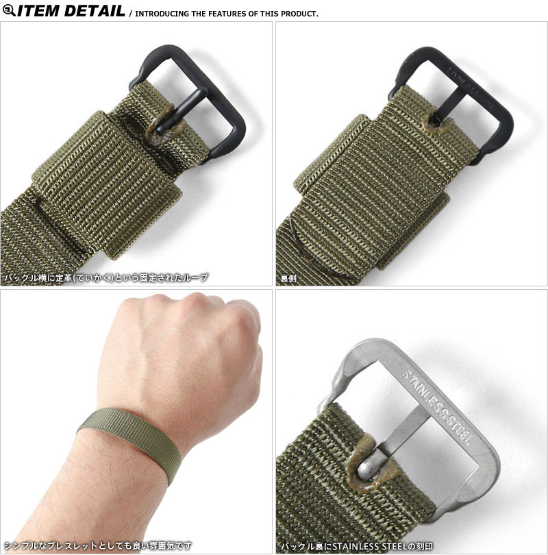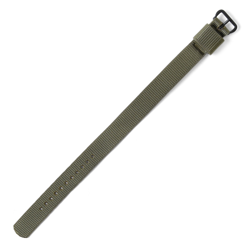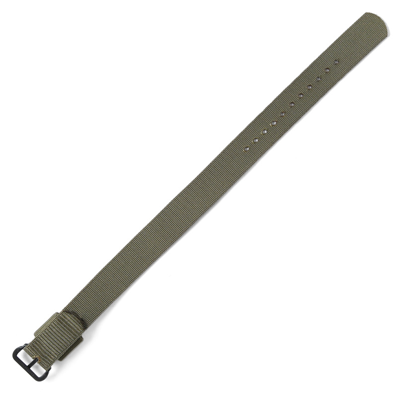 強度のある軍事用に開発された非常にタフなナイロン生地を使用しています。16mmサイズのベルトで多くの時計にフィットしますし、最適なフィット感のための11個のベルト穴が開けられています。