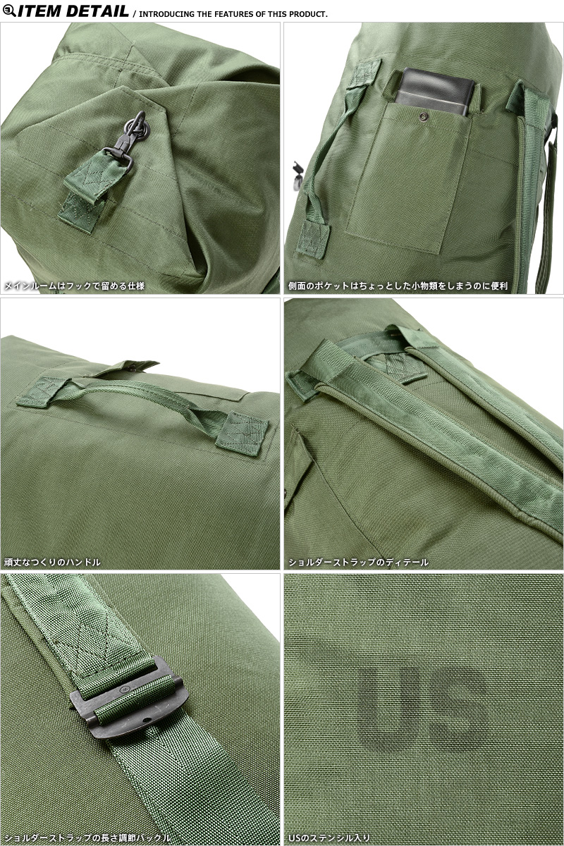兵士が移動する際、個人の持ち物を詰め込んで運搬する為の大容量なダッフルバッグです。リュックのように背負えるように長さ調節可能なショルダーストラップがついているほか、横向きに持てるよう側面にはキャリングハンドルも備えられています。バッグ外側には小さなポケットがあり、手帳などの小物を収納するのに便利です。また、頑丈なナイロン生地の裏側には防水加工が施されています。口は留め金を3つのハトメに全て通し、最後にフックをとめることでしっかり閉じるようになっており、留め金に南京錠を通すことで施錠することも可能。収納力や耐久性は本物というだけあって言うことなしです。一人旅やタウンユースにはもちろん、アウトドアやバイク乗りの方にも大変おすすめなアイテムです。
