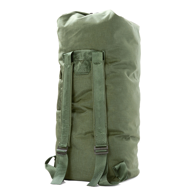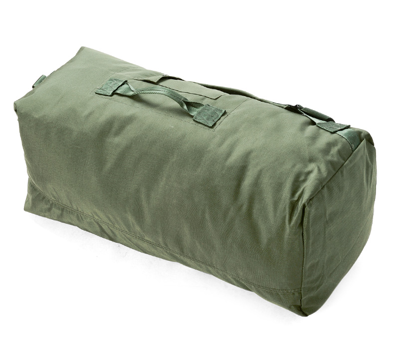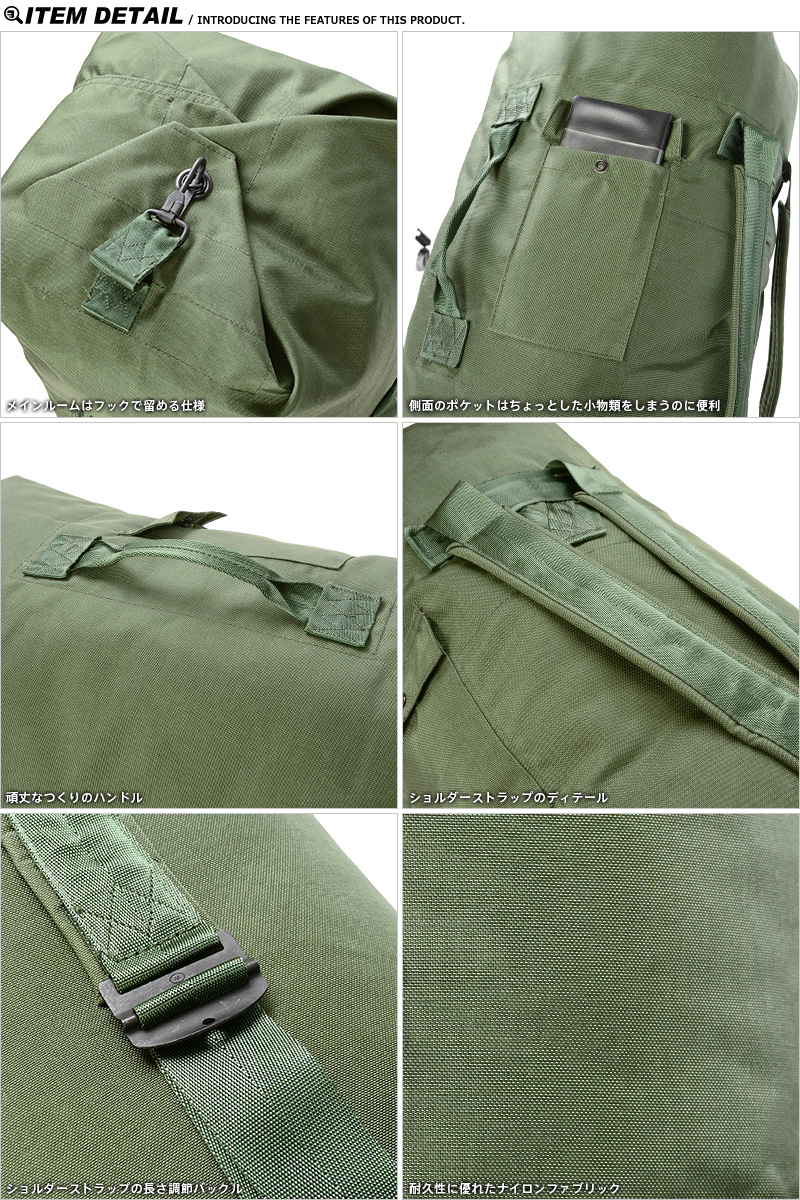兵士が移動する際、個人の持ち物を詰め込んで運搬する為の大容量なダッフルバッグです。リュックのように背負えるように長さ調節可能なショルダーストラップがついているほか、横向きに持てるよう側面にはキャリングハンドルも備えられています。バッグ外側には小さなポケットがあり、手帳などの小物を収納するのに便利です。また、頑丈なナイロン生地の裏側には防水加工が施されています。口は留め金を3つのハトメに全て通し、最後にフックをとめることでしっかり閉じるようになっており、留め金に南京錠を通すことで施錠することも可能。収納力や耐久性は本物というだけあって言うことなしです。一人旅やタウンユースにはもちろん、アウトドアやバイク乗りの方にも大変おすすめなアイテムです。