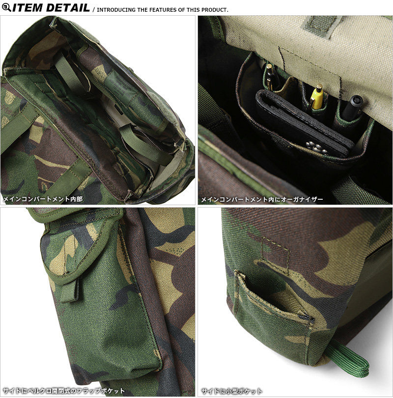 サイドの片側にはベルクロ開閉式のフラップポケットと撥水性に優れた厚手のナイロン素材でショルダーバッグとして使用可能です。