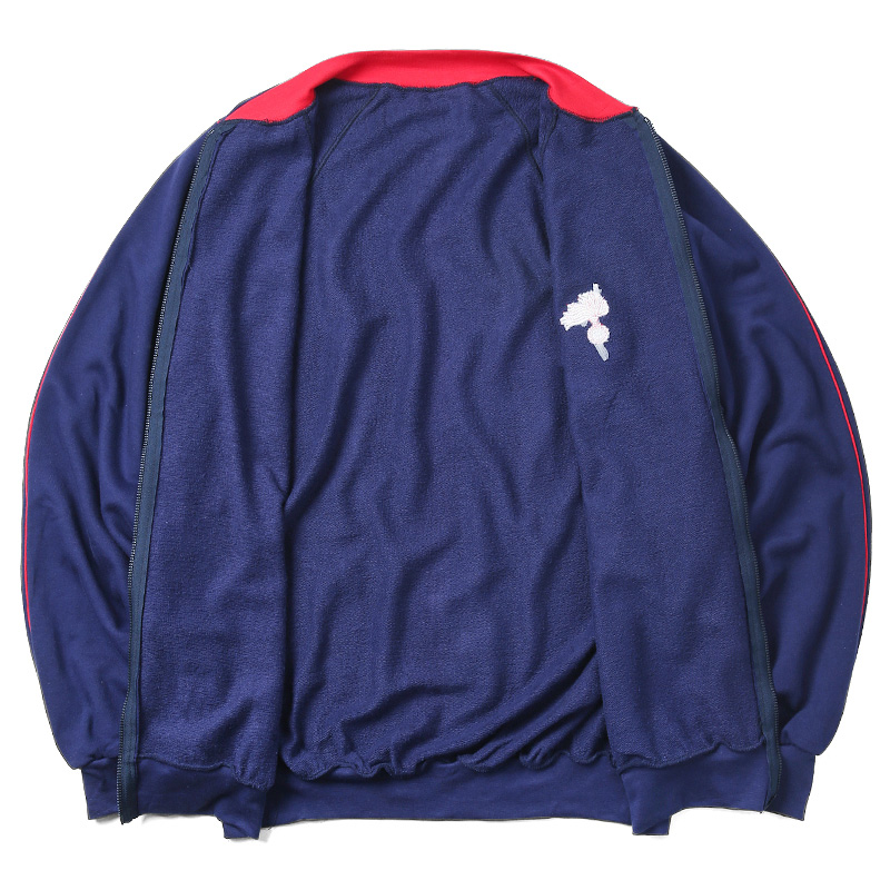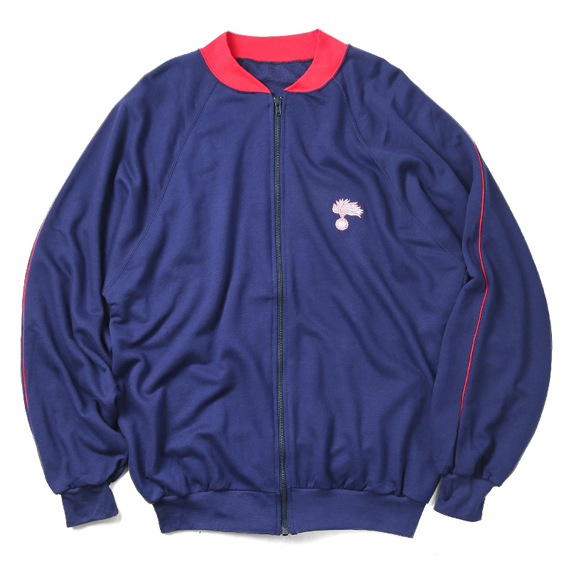 イタリア国家憲兵隊実用のトレーニング用 トラックジャケットです。ややトーンの明るいネイビーにレッドの配色が絶妙なバランスで、90年代ファッションを彷彿とさせるシルエットとデザインで、どこかトレンド感もあり、特に古着好きの方には魅力的な一着ではないでしょうか。袖に施されたカラビニエリマーク入りのテープがデザインのアクセント。両サイドにはポケットが配置され、ラグランスリーブでアームに余裕を持たせた動きやすい仕様です。別売りのトレーニング トラックパンツとのセットアップもオススメ!羽織りやすく、幅広いシーズンに対応してくれるアイテムです。