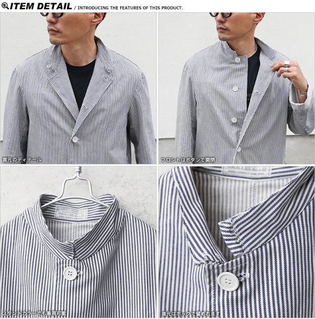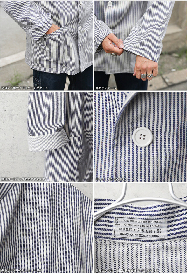 | 商品説明 | 実物 新品 デッドストック イタリア海軍 ヒッコリーストライプ コックジャケットのご紹介です。 イタリア海軍のデッドストックアイテムで、ヒッコリー柄が目を惹くコックジャケットが登場しました! ライトな素材感とワークテイストなヒッコリーストライプはワークウェアで使用される事が多く、汚れが目立ちにくい点からコックジャケットとして採用されています。 襟元のデザインがテーラードジャケットなどに多いノッチドラペルと、首元のホックを留めてスタンドカラーで着用することも可能で様々な着回しができるジャケットです。 柔らかで薄手のヒッコリー素材ですので様々な季節で使用でき、シルエットも良いのでボタンを開けてさらっと羽織るだけで雰囲気のあるスタイリングが完成する他にはないミリタリーワークジャケットです! |