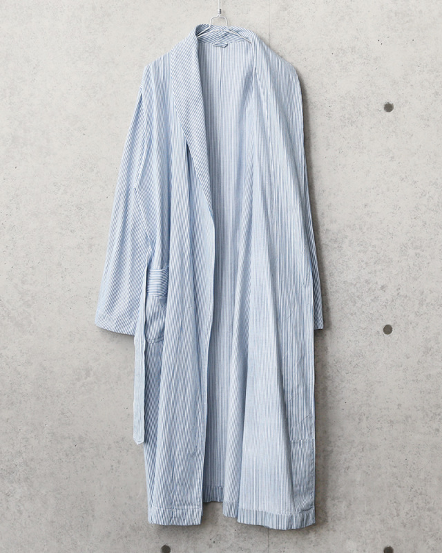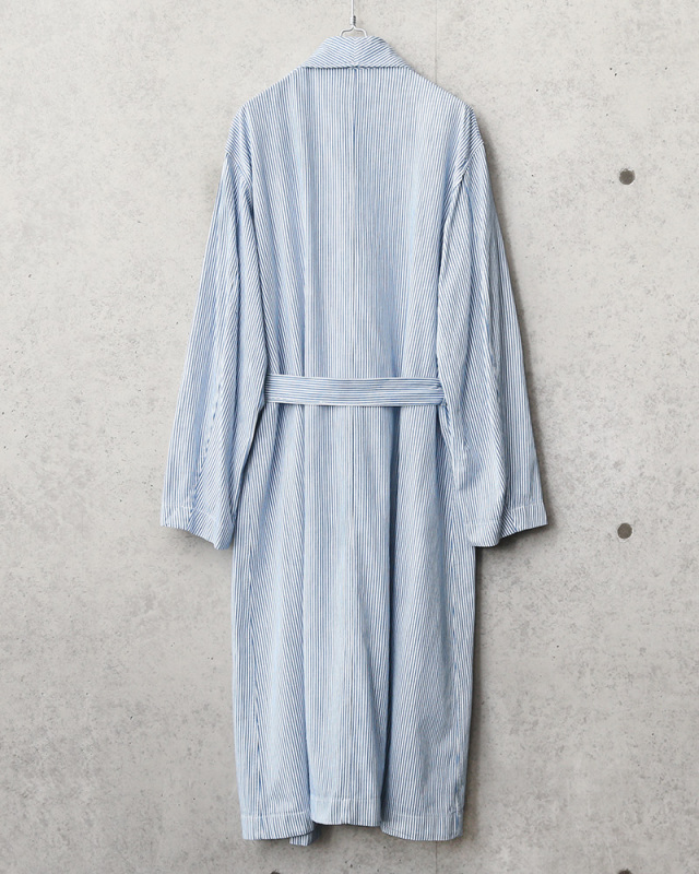 ホワイトとブルーのストライプが爽やかな色合いのロングコートで、ショールカラーの襟元が上品な印象でショップコートのように着ていただけるワークスタイルにもピッタリのデザインです。