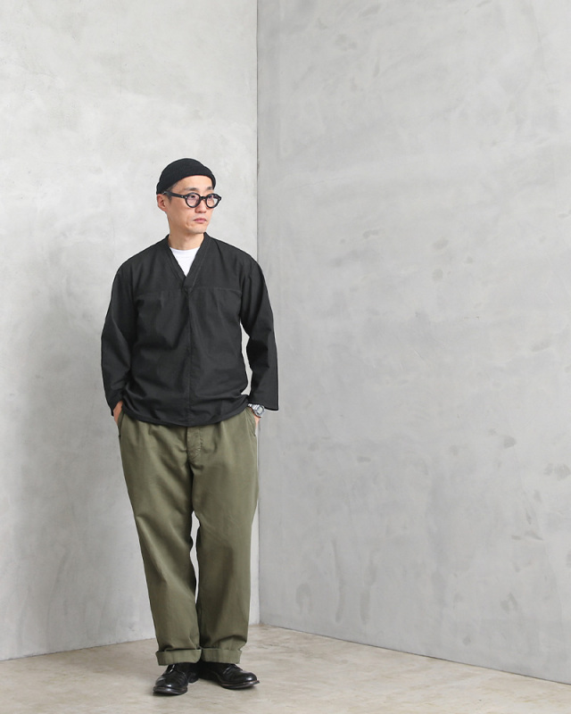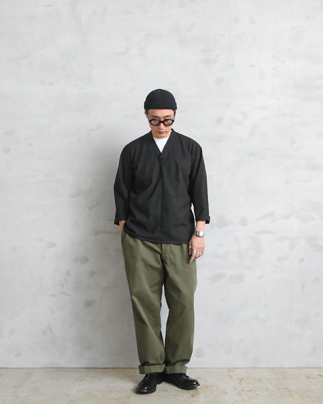| 商品説明 | 実物 新品 デッドストック ロシア軍 80s ヨーク切り替え Vネック スリーピングシャツ BLACK染めのご紹介です。 1980年代のロシア軍放出のスリーピングシャツです。スリーピングシャツの中でもロシア軍のものは特に人気があり、こちらはあまり見かけないVネックデザインです。更に今回入荷の物は胸にフットボールシャツなどで見られる ヨーク切り替えのある珍しいタイプのスリーピングシャツになります。 元々ホワイトだったのですが、染め職人に丁寧にBLACK染めしていただきました。 BLACKにする事でかなり良い雰囲気になり、着込むことでさらに風合いの増す1着です。肌触りがよく着心地の軽いコットン生地を使用。リネンのような粗めの織りで非常に味のある生地感です。 スラックスなどと合わせてモードな雰囲気も楽しめますし、夏には着崩してショーツなどもオシャレです。 トップス・インナー問わず幅広く活用していただける一着ではないでしょうか。 袖をロールアップするなど、程よく着くずすし抜け感を出すことで、肩の力を抜いた着こなしが楽しめる、男女問わずお使いいただけるアイテムで希少なオススメの1枚です。 |