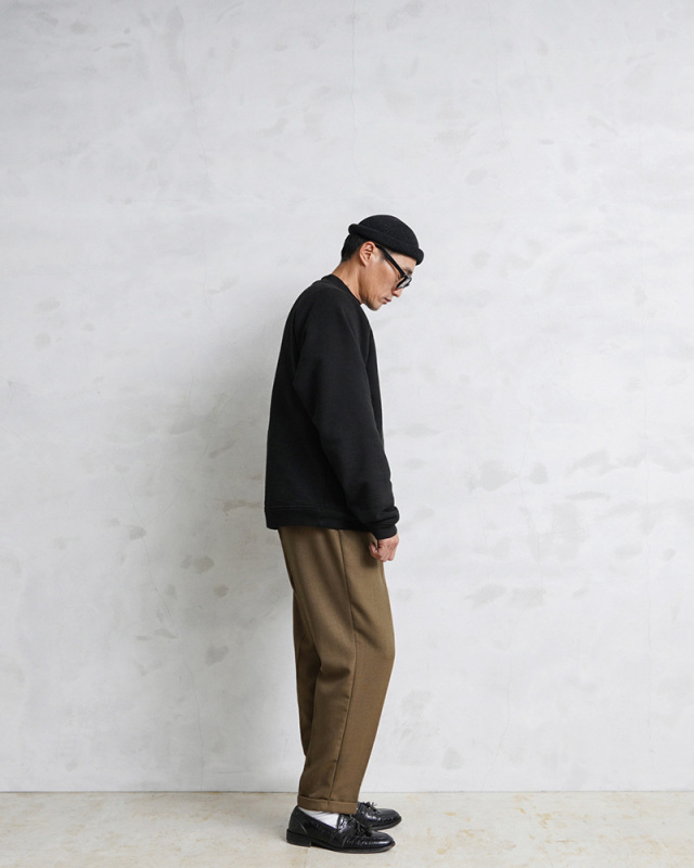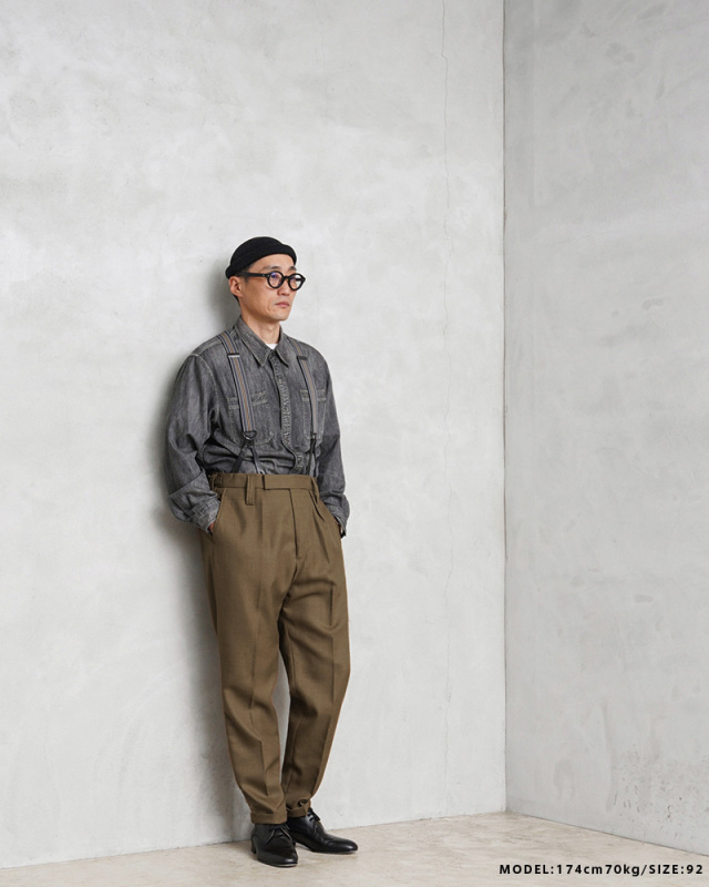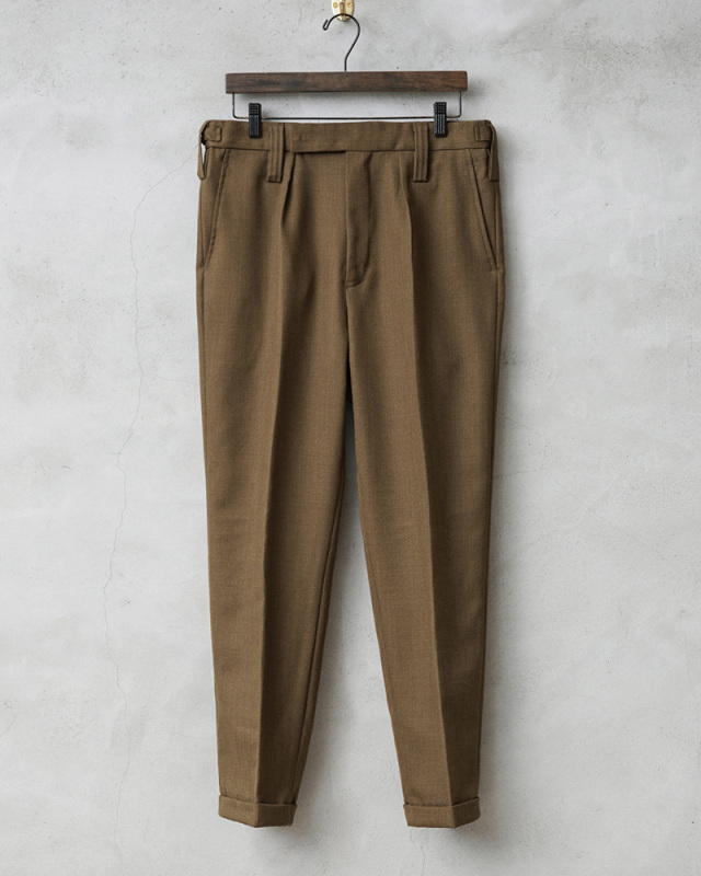 新たなデザインへと再構築するリメイクラインから、当店でも大人気アイテムの「イギリス陸軍 ALL RANKS BARRACK DRESS トラウザーズ」のデッドストック品を使用したテーパードシルエットのトラウザーズを製作しました。 複数回に渡るサンプル製作を経て、専門の職人の手により完成されたテーパードシルエットと、ダブルで仕上げられた裾にカスタムすることでより現代向けにアレンジ。今回、新たに再販するにあたって縫製とパターンを見直し、より美しいシルエットへとアップデートしました。テーパードシルエットやダブル仕立てを再現しつつも、縫い釣れの起こりやすいサイドシームをより自然なかたちに仕上げています。 1990~2000年代採用のイギリス軍放出トラウザーはパレードや祭事などの準礼服として、イギリス陸軍の全階級で採用された制服です。シルエットをリメイクすることで、当時の制服の雰囲気を残しつつ、より現代的でスタイリッシュなアイテムとして人気を集めています。 サラッと肌触りの良いウール/ポリエステル混合の生地を使用。フロントは使いやすいジッパーフライ仕様で、ウエスト周りにはアジャスターとサスペンダー用ボタン付きです。落ち着いたブラウンカラーが雰囲気のある1本です。 ドレスパンツながらカチッとしすぎない感じで、クラシカルなスタイルからカジュアルまで幅広くこなしてくれます。適度なゆとりは残しつつも綺麗なシルエットとベストな丈感が革靴はもちろん、スニーカーやサンダルとの相性も抜群です。 |