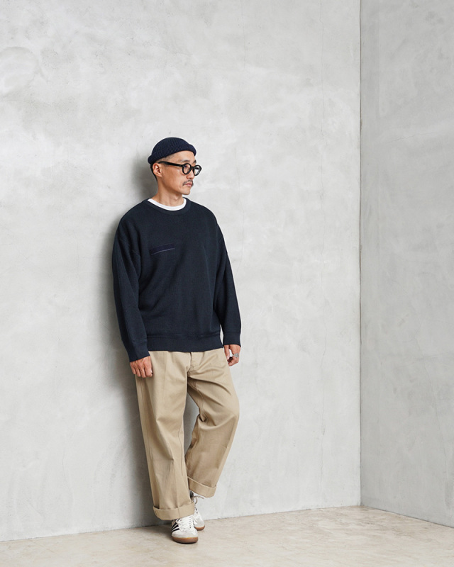 | 商品説明 | 実物 USED フランス軍 クルーネック ミドルゲージニット セーター ネイビーのご紹介です。 フランス軍より放出されたバランスの取れたミドルゲージニットを使用したセーターが入荷しました。 コマンドセーターのような肩のエポレットなどが付属していないシンプルなデザインなのでエポレットが苦手な方にもぜひおすすめしたいフランス軍が使用していたセーターです。 右胸と左袖に同系色のベルクロが付属していますのでミリタリーテイストはきちんと感じれる作りになっています。首元のクルーネックは目の細かいしっかりとしたリブ素材が使用されていますので適度に伸縮しながらも伸びに強い首周りになっています。 袖先と裾部分のリブの境目には編み方を変えることで独特な網目が特徴的。シンプルながら非常にデザイン性が高い1枚になっています。丁度よい厚みのあるミドルゲージは単体でもアウターのインナーとしても活躍しますし、1枚あると重宝し、とても着回しが利く万能アイテムです。 |