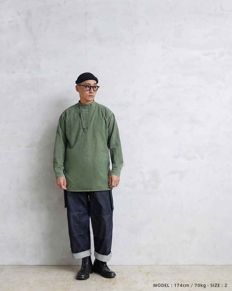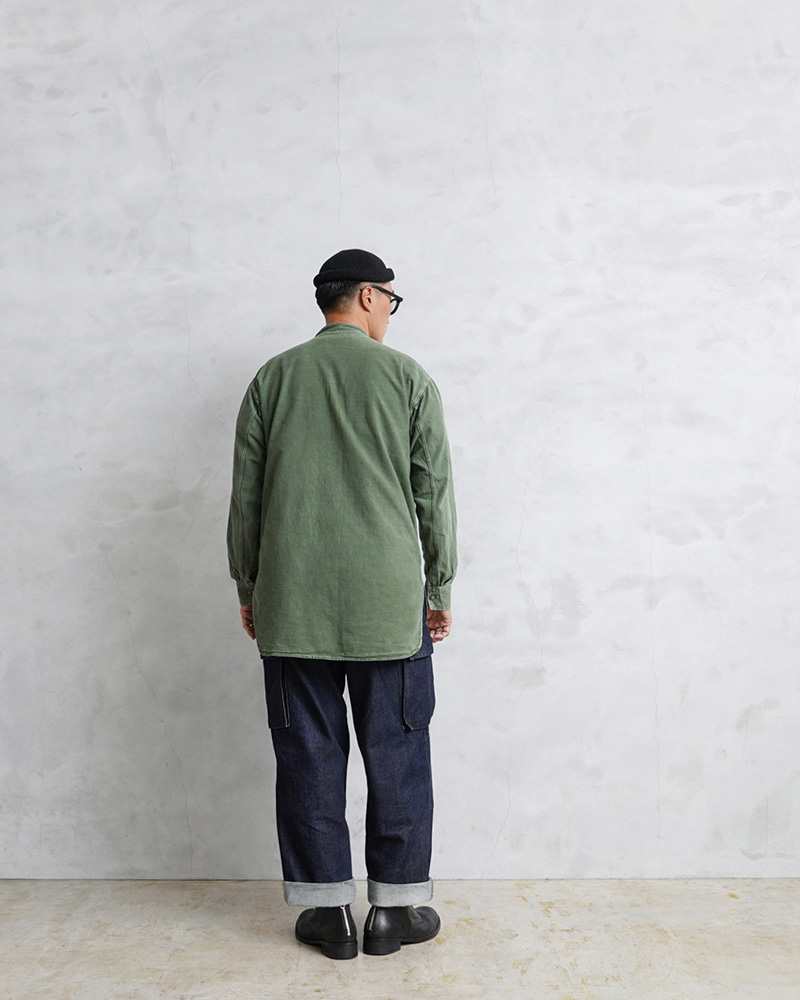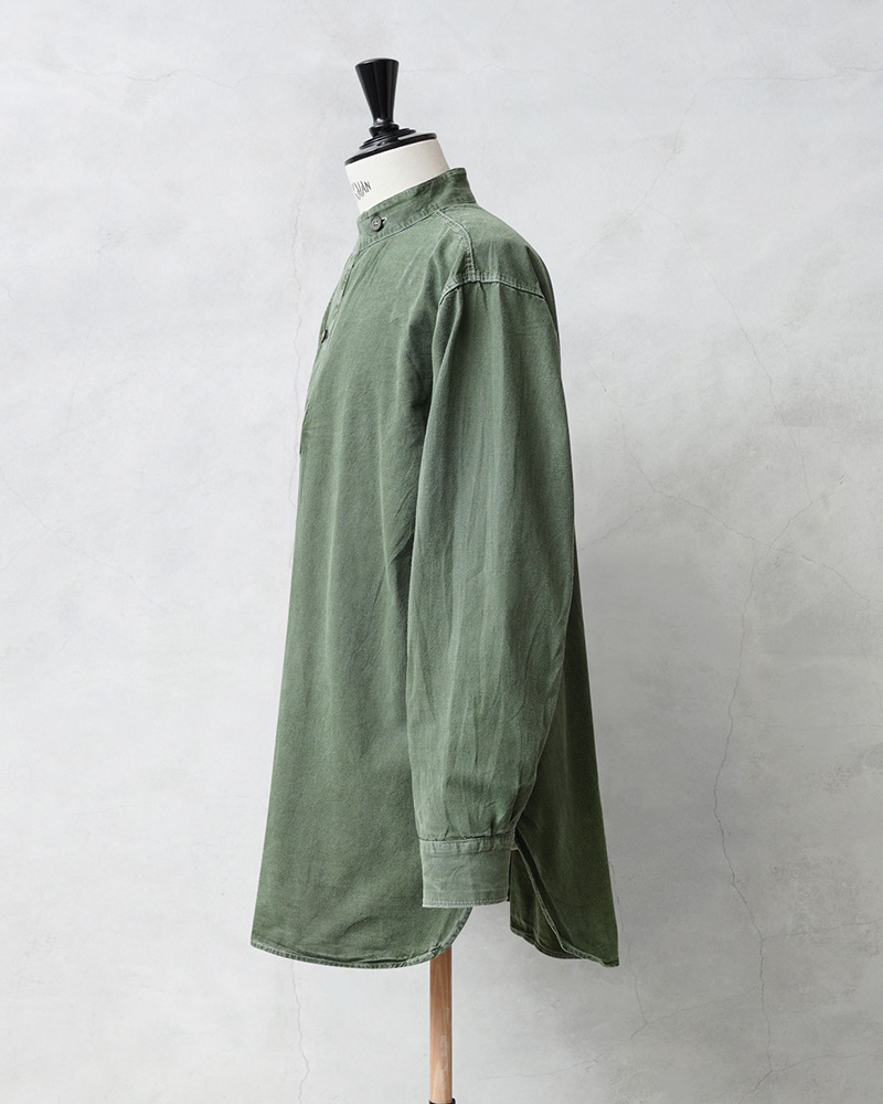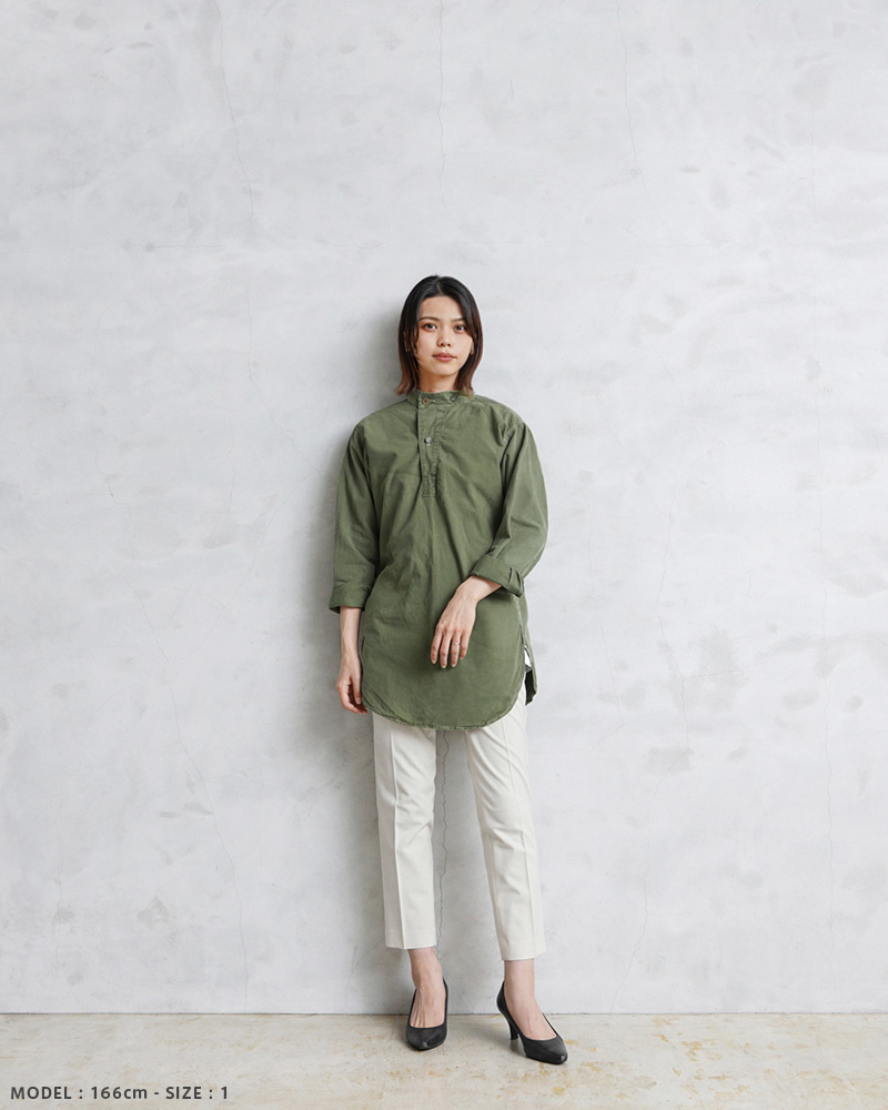 | 商品説明 | 実物 USED スウェーデン軍 M-55 スタンドカラー プルオーバーシャツ グリーン 初期型のご紹介です。 スウェーデン軍が1955年に採用したプルオーバーシャツです。その中でも初期に数年間のみ生産されていたスタンドカラータイプの非常に希少なモデルが入荷しました!スウェーデン軍らしいグリーンが、着込まれることでのみ現れるアタリやフェード感が出た素晴らしい状態です。新品には出せない生地感で、色目も様々な表情のある1枚で、着合わせやすさとコーディネートの馴染みが良いのが特徴の1つです。 シンプルなソリッドボディに、バンドカラーのような襟元に、斜めに取り付けるボタンのデザインも秀逸で、USEDですがいい感じの経年変化が出たボディでバランスの良い佇まい。プルオーバーが非常にセンスが良い1着です。ロングレングスのヨーロッパらしい繊細でモードな雰囲気が魅力でもあります。 プルオーバーシャツの裏地は若干、微起毛していますので春先や秋口にもさらっと着ていただけますし、袖をロールアップして着ても印象が変わり、レベルの高い着こなしに。着丈の長さを生かしてグランパシャツのように着てもかっこいいと思います。フロントからサイドにかけて大きくラウンドカットした裾周りです。 1955年から1990年代まで仕様を変えながら採用されていたということも、このアイテムが洗練された使いやすアイテムだという証明でもあり、特にこの初期型は価格も高騰していて入手困難になっているアイテムです。 ミリタリーシャツらしからぬ品のあるディテールは1枚で着映えする、流行に左右されることのない洗練されたヴィンテージのクラシカルなプルオーバーシャツです。 |