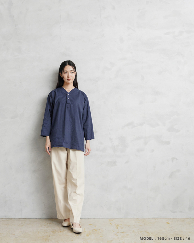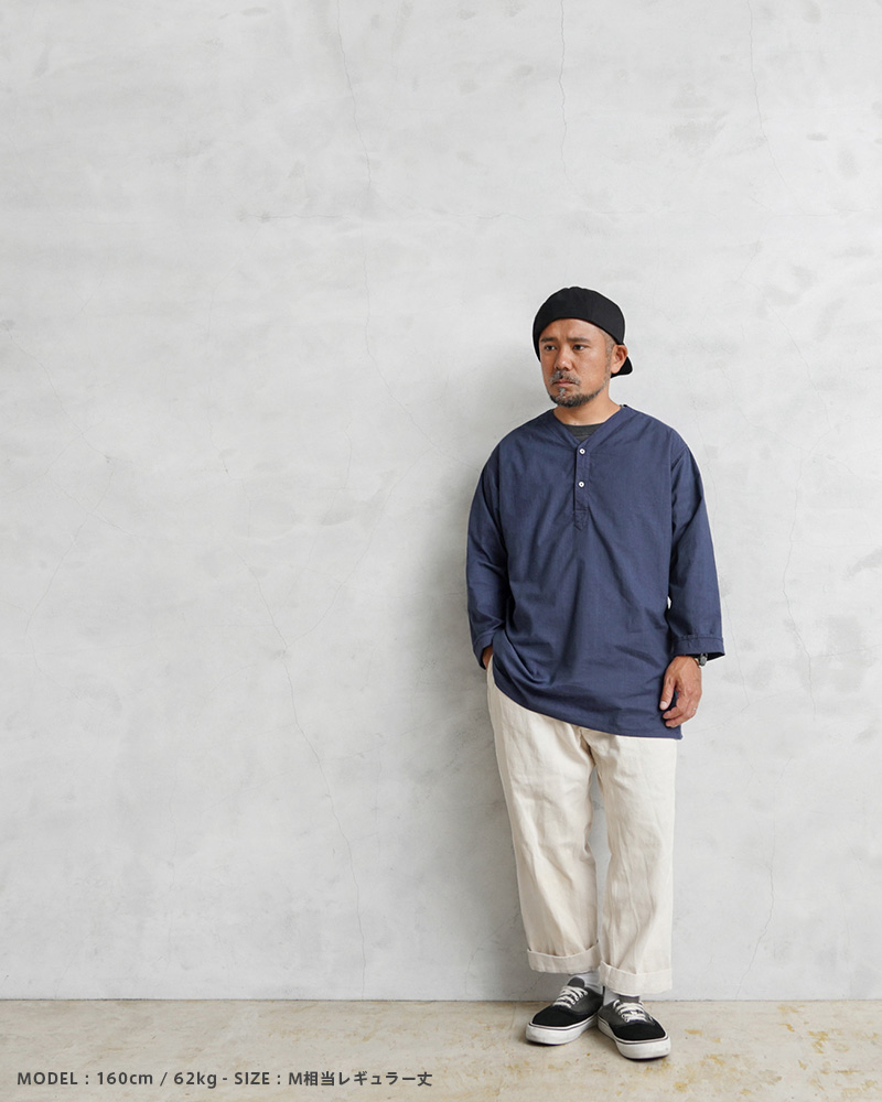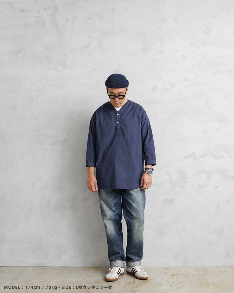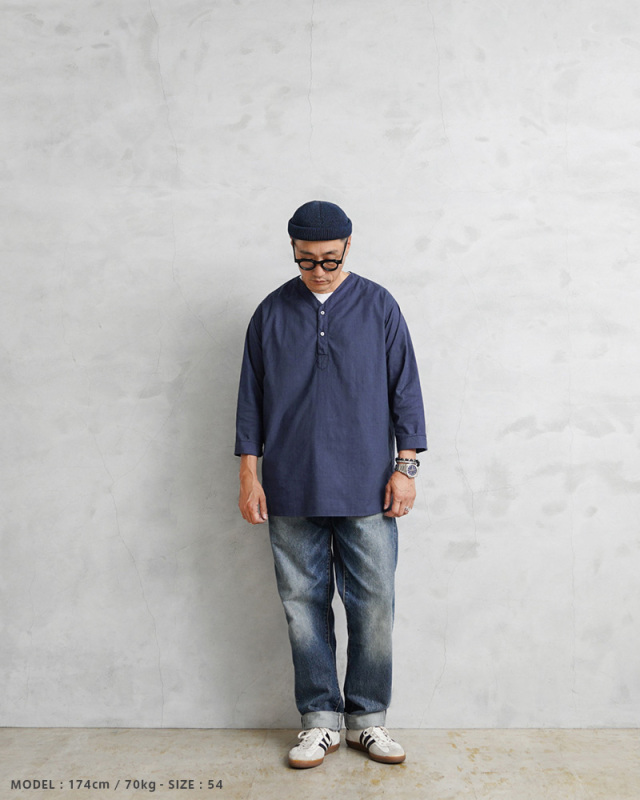 | 商品説明 | 実物 新品 ロシア軍 80s ヘンリーネック スリーピングシャツ NAVY染めのご紹介です。 1980年代のロシア軍放出のスリーピングシャツです。スリーピングシャツの中でもロシア軍のものは特に人気があり、こちらはV型のヘンリーネックデザインです。 元々はホワイトの生地ですが、染め職人に丁寧にNAVY染めを施していただきました。ブルーに近いNAVYカラーが爽やかでアイテムを選ばず合わせやすい雰囲気に仕上がっています!着込むことでさらに風合いの増す1着です。肌触りがよく着心地の軽いコットン生地を使用。リネンのような粗めの織りで非常に味のある生地感です。 スラックスなどと合わせてモードな雰囲気も楽しめますし、ショーツなども相性抜群です。キレイめからカジュアルまで、幅広いスタイルにマッチしてくれる一枚。プルオーバーのゆったりとしたスタイルはトップス、インナー問わず幅広く活用していただける1着ではないでしょうか。 袖をロールアップするなど、程よく着くずすし抜け感を出すことで、肩の力を抜いた着こなしが楽しめる、男女問わずお使いいただけるアイテムで希少なオススメの1枚です。 |
