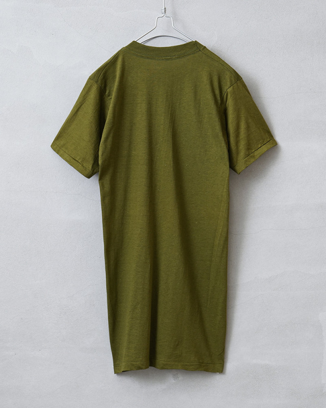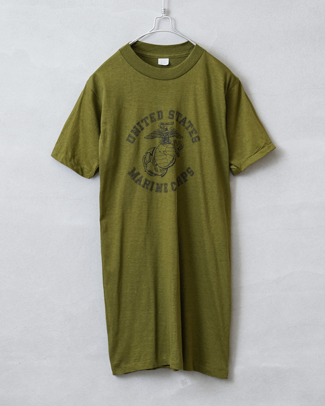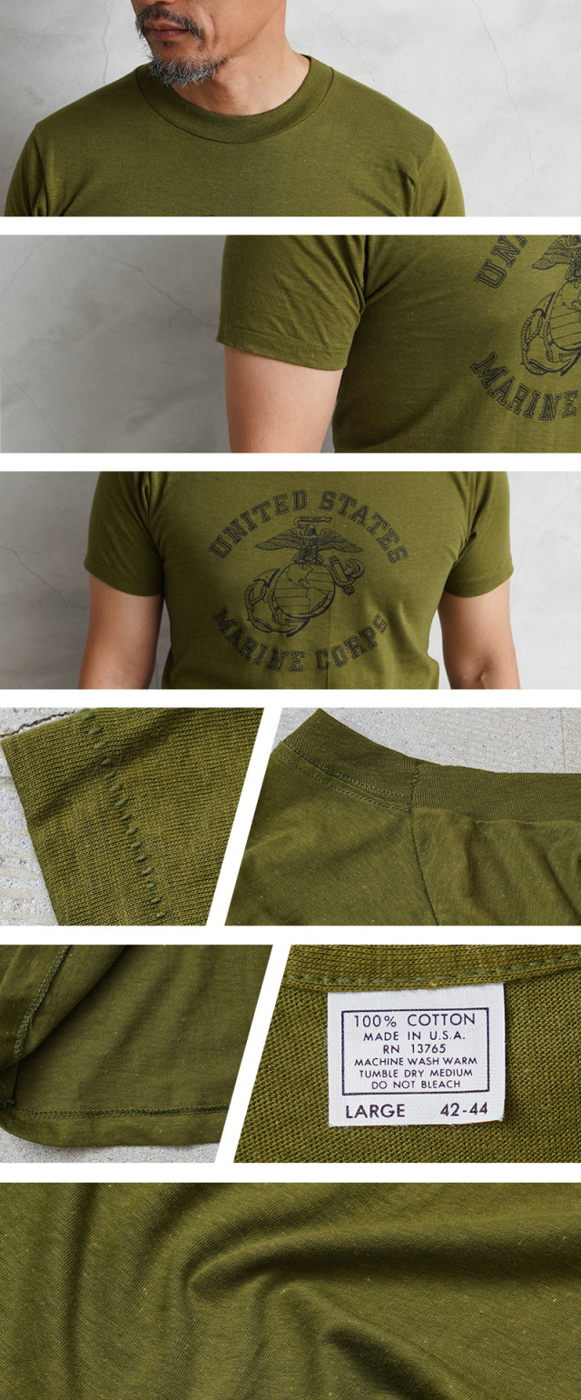 | 商品説明 | MADE IN USA デッドストック USMC(United States Marine Crops)米海兵隊 プリントTシャツのご紹介です。 胸にUSMCの"Eagle,Globe & Anchor"が中央にプリントされた、1970年代から80年代頃のアメリカ製民生品Tシャツです。 コットン100%の目が詰まった生地は柔らかく適度な伸縮性があり、肌触りがよく心地よい着用感が得られます。ビンテージ感ある生地感とやや明るみのあるアーミーグリーンのカラーは雰囲気抜群です。 袖口と裾は、ビンテージ Tシャツでよく見られるシングルステッチで仕上げられており縫い目が目立たないシンプルな見た目が特徴です。胴周りを1枚の布で仕上げた丸胴仕様は、サイドに縫製をなくすことで素肌へのストレスを軽減しています。 シルエットはやや着丈が長めで、洗うと縦に縮みが入り、目が詰まった生地は横方向へ引っ張られると伸縮することで、身体に合った状態へと馴染んでいきフィット感を高めます。タックインスタイルもおすすめです。 スッキリとしたシルエットと印象的なデザインなので1枚で着ていただいても良いですし、肌ざわりも良いのでインナーとしても活躍してくれます。 MADE IN USA |