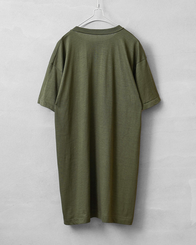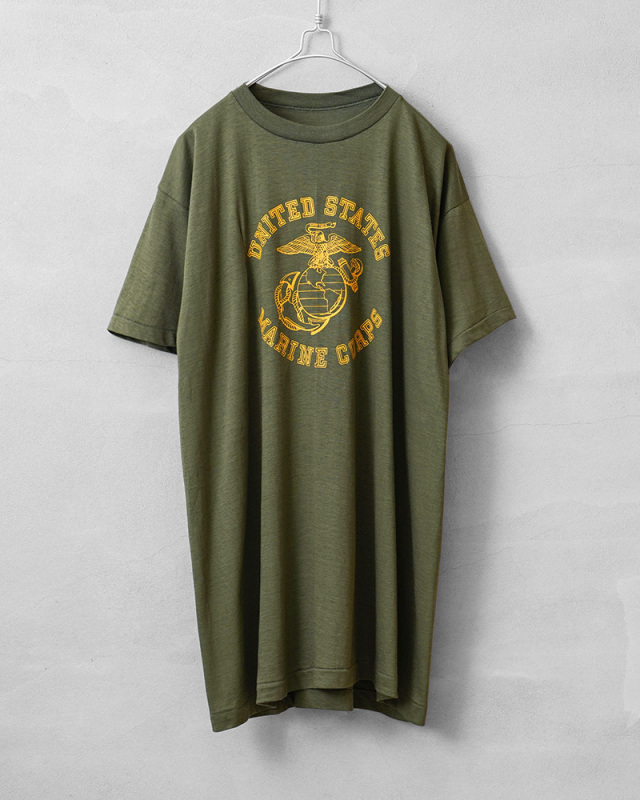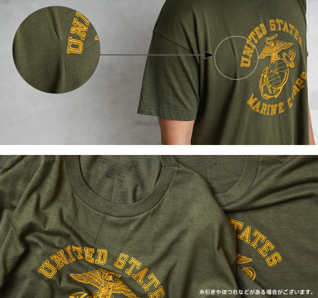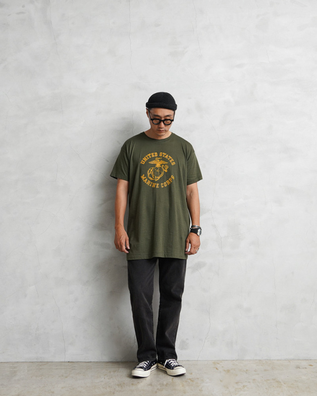 | 商品説明 | MADE IN USA デッドストック USMC(United States Marine Corps)米海兵隊 イエロープリントTシャツのご紹介です。 胸にUSMCの"Eagle,Globe & Anchor"が中央にプリントされた、1970年代から80年代頃のアメリカ製民生品Tシャツです。アーミーグリーンのボディにイエローのプリントが映えるデザインです。 コットン100%の目が詰まった生地は柔らかく適度な伸縮性があり、肌触りがよく心地よい着用感が得られます。ビンテージ感ある生地感とアーミーグリーンのカラーは雰囲気抜群です。 袖口と裾は、ビンテージ Tシャツでよく見られるシングルステッチで仕上げられており縫い目が目立たないシンプルな見た目が特徴です。胴周りを1枚の布で仕上げた丸胴仕様は、サイドに縫製をなくすことで素肌へのストレスを軽減してくれます。 シルエットはやや着丈が長めで、洗うと縦に縮みが入り、目が詰まった生地は横方向へ引っ張られると伸縮することで、身体に合った状態へと馴染んでいきフィット感を高めます。タックインスタイルもおすすめです。 時代を感じる着丈長めのシルエットとミリタリーらしい色合いにイエロープリントが印象的な一枚はコーディネートの主役にもなりますし、柔らかく肌なじみのいい生地感でインナーの役割も果たしてくれる一枚です。 MADE IN USA |