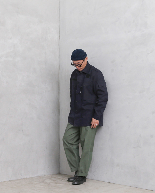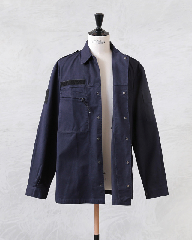 | 商品説明 | 実物 USED オランダ海軍 サイドスリット ユーティリティ ワークジャケットのご紹介です。 オランダ海軍で使用されているユーティリティワークジャケットが入荷しました。 ブラックのスナップボタンで開閉するフロントボタンと、フロントポケットが斜めにデザインされ、ファスナーで開閉する特徴的なディテール。引手が付いていますのでファスナーの開閉も便利です。 左胸の内側にはベルクロ開閉のインナーポケット付きで、左袖にはペンホルダーに最適なユーティリティポケットが付属しています。胸ポケット上部にはベルクロ付きで、肩にはループを通して、ベルクロに取り付ける珍しい仕様のエポレットが付属するミリタリージャケットらしいデザインです。 袖口もスナップボタンで調節が可能で、サイドにはスリット入ったデザインなのでシャツジャケット感覚で使える1枚です。コットンポリの混紡されたツイル生地が耐久性が高く、シワになりにくく、速乾性にも優れています。洗練された印象を与えるダークネイビーカラーのワークジャケットです。 |