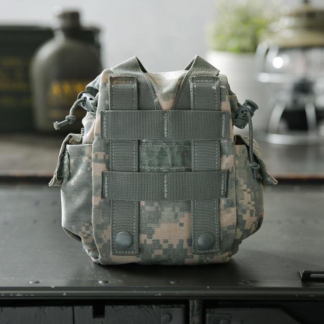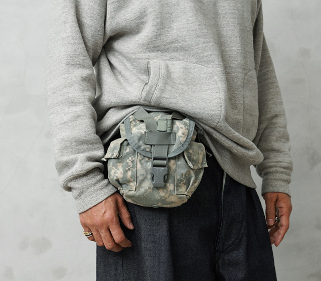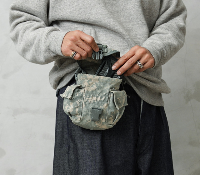 | 商品説明 | 実物 USED 米軍 MOLLE II CANTEEN GENERAL PURPOSE ポーチ UCPのご紹介です。 制式名称:MOLLE II POUCH, CANTEEN GENERAL PURPOSE アメリカ陸軍が2005年に採用した迷彩服「ACU」に使用されたUCPの、約1Lの水筒“1QTキャンティーン”を入れるためのポーチが入荷しました。水筒だけでなく汎用ポーチとしても使用可能です。 高さを調整することができるバックル付きのフラップに、ポーチの開口部はドローコードで絞り込むことができ重いキャンティーンもしっかりとサポート。 MOLLE対応でウェビングが付いたバッグやベスト、ベルトなどに装着可能になっています。 バックル調整することで、350~500mlのペットボトル2本も楽々収まり、スマホ、充電器、折れ財布、メモ帳など日常での必需品も十分に入るサイズ感。コロンとした見た目と、主張しすぎないUCPがアウトドアからシティユースに使い勝手の良いアイテムです。 ※撮影に使用した小物は付属しません。 |