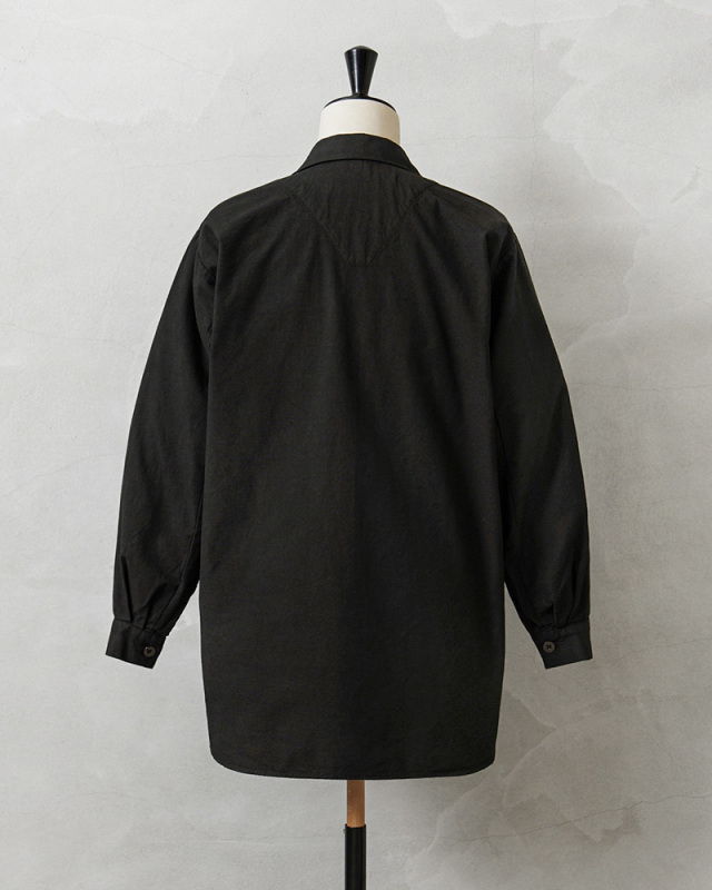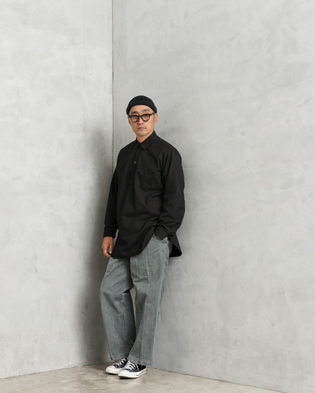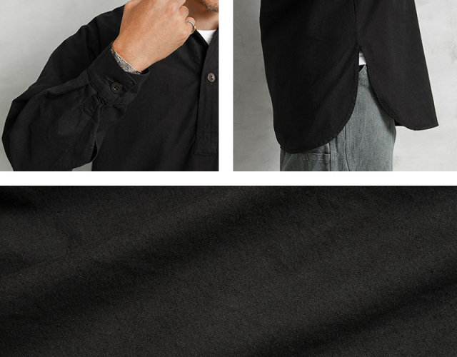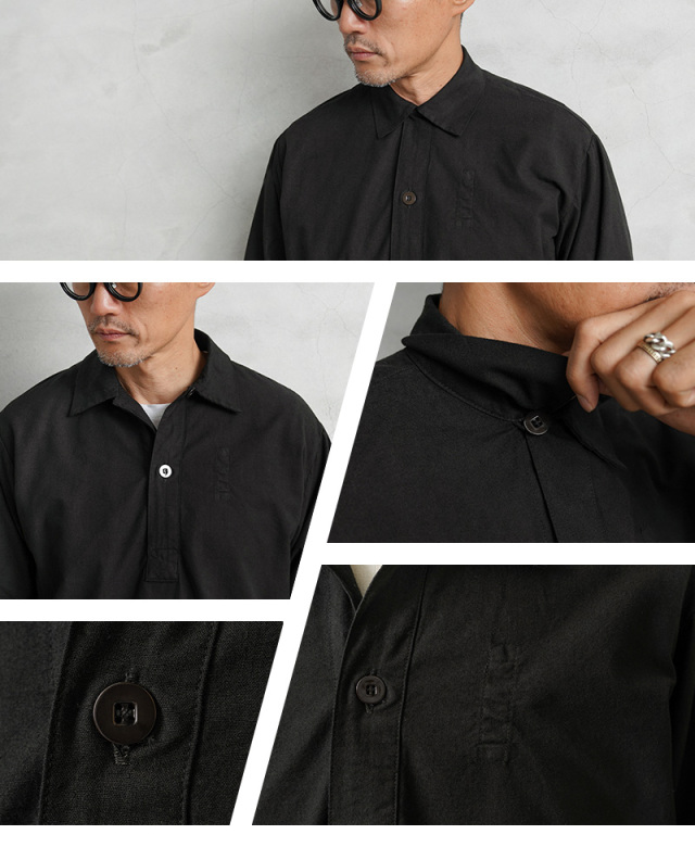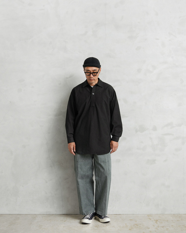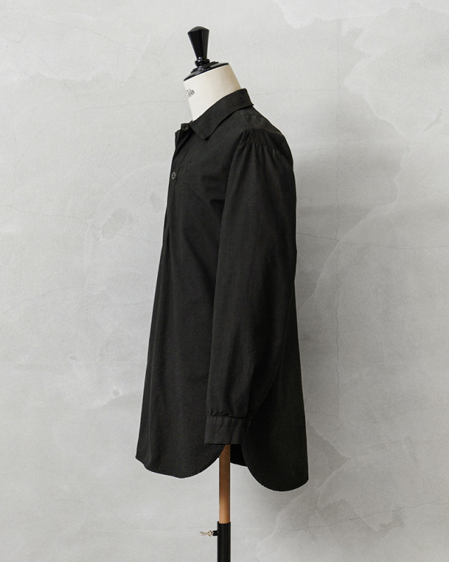 | 商品説明 | 実物 新品 スウェーデン軍 M-55 プルオーバーシャツ ラウンドカット BLACK染めのご紹介です。 スウェーデン軍が1955年に採用したプルオーバーシャツです。プルオーバーが非常にセンスが良い1着です。ロングレングスのヨーロッパらしい繊細でモードな雰囲気が魅力でもあります。 元々深みのあるグリーンやサックスブルーだったのですが、染め職人に丁寧にBLACK染めしていただきました。 BLACKにする事でより良い雰囲気になり、着込むことでさらに風合いの増す1着です。 年代を感じる生地感に表情のある1枚で、着合わせやすさとコーディネートの馴染みが良いのが特徴の1つです。シンプルなソリッドボディに、円形のボタンが程よいアクセントになっています。 プルオーバーシャツの裏地は若干、微起毛していますので春先や秋口にもさらっと着ていただけますし、袖をロールアップして着ても印象が変わり、レベルの高い着こなしに。着丈の長さを生かしてグランパシャツのように着てもかっこいいと思います。フロントからサイドにかけて大きくラウンドカットした裾周りで、襟元のボタンはトップボタンがループになっている仕様です。 1955年から1990年代まで採用されていたということもこのアイテムが洗練された使いやすいアイテムだという証明でもあると思います。年々入荷する機会も少なくなっているクラシカルなプルオーバーシャツです。 |