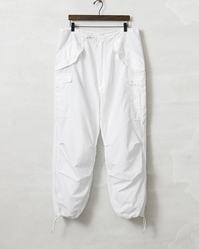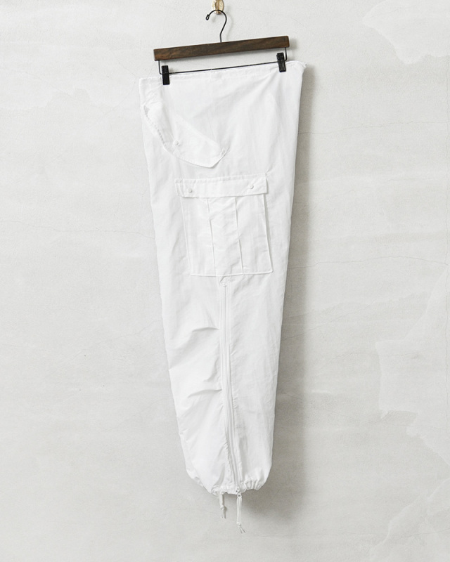 | 商品説明 | 実物 新品 デッドストック 米軍 スノーカモ オーバーパンツ カーゴポケット付きのご紹介です。 制式名称:TROUSERS,SNOW CAMOUFLAGE,WHITE 米軍実物放出品の雪中での行軍や戦闘の際に着用されたオーバーパンツです。 冬の戦闘服の上に着用するためにかなりゆとりのある作りとなっており、フロントジッパーや裾のジッパーは大きく開閉し、衣類やブーツを着用したままでも穿けるように計算されています。ウエストにはコード入りで、裾はゴムシャーリングの機能的な仕様となっています。 パンツの上から履くオーバーパンツのためポケットは貫通ポケットです。サイドには貫通式ではないカーゴポケットが付属したデザインなので1枚で着用する際にも収納に困ることなありません。内側のウエスト付近にもポケット付きで、パンツを小さく折りたたみ、このポケットにパッカブルすることでコンパクトに持ち運びもできる機能的なデザインになっています。内側にはライナー取り付け用のボタンやサスペンダーを取り付けることができるループなど米軍らしいディテールです。 シャリ感のあるナイロン素材が使用された独特の素材で、膝にはタックが設けられていますので広い可動域を確保しています。このゆったりしたワイドシルエットがいい感じです! このパンツ自体、アメリカでも手に入りにくくなってきていますし、見つかっても高騰しています。パッカブル可能でカーゴポケット付きに進化した、今後ますます希少になっていくスノーカモパンツです! |
