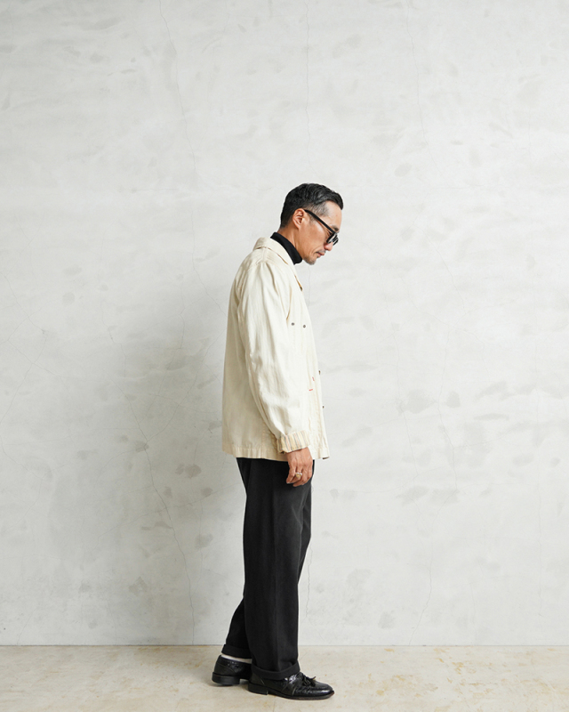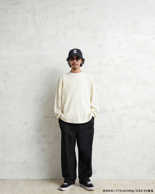 | 商品説明 | WAIPER.inc 実物 新品 デッドストック 米軍 ヴィンテージ HOSPITAL フランネル リメイクパンツ ポケット付き BLACK染めの ご紹介です。 制式名称:TROUSERS,MEN’S,PAJAMA COTTON FLANNEL 1960年代を中心とした年代の古い、米軍のコットンフランネルをさらに使いやすいように、雰囲気の良いパッチポケットとバックポケットをデザインしてリメイクを施しました。さらに、フロントのベルトループの位置を調整し、サイドとバックにもループを追加することで、お手持ちのベルトを用いて着用可能に。サイズ選びの幅も広がるリメイクアイテムになっております。 そして本来はライトブルーのフランネルパンツを染め職人に丁寧にBLACK染めしていただきました。BLACKにする事で落ち着きのある雰囲気の良い色合いに仕上がりました。 米軍の医療機関などでホスピタルパンツとして使用されていたアイテムで、主に戦闘外の後方エリアで使用されていたようです。負傷して回復中の戦闘要員にも適切に治癒しながら快適に過ごせるようにゆったりとした作りになっています。フロントはウエスト部分にスナップボタンが1つ付属していますが、前開きはステッチで区切られていますので気になりません。ウエストのコードで絞って穿いていただくデザインです。 肌ざわりの良いコットンフランネル100%素材で、表地と裏地ともに起毛加工が施されていますので着用感が素晴らしく保温性にも優れています。パジャマとしての使用にはもちろん最適ですが、イージーパンツのようにラフに穿いていただくのもおすすめしたいパンツです。 根強い人気アイテムのスリーピングパンツは使い勝手が良くなるようリメイクし、さらにBLACK染めしたことで着こなしの幅が広がりました。米軍のヴィンテージアイテムで希少なデッドストックに製品染めを施した贅沢な1枚です。 |
