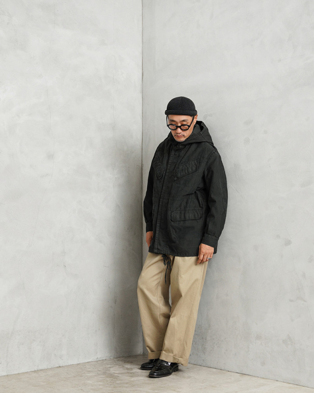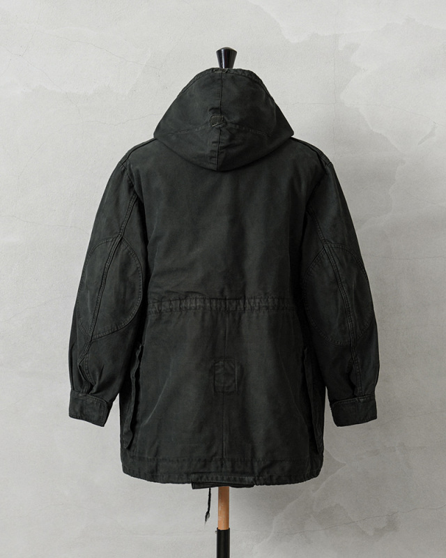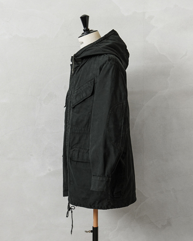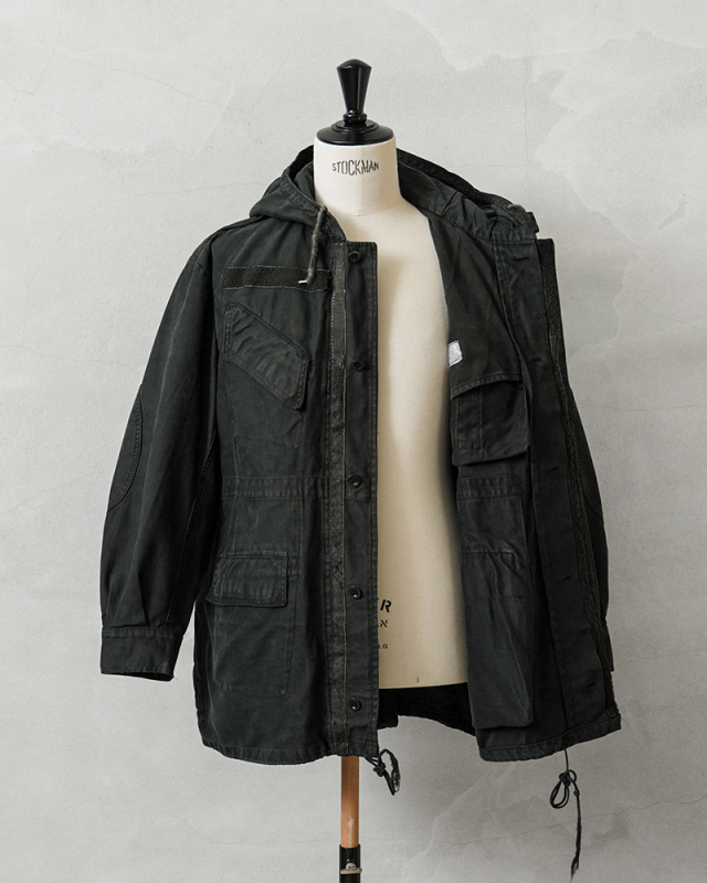 | 商品説明 | 実物 USED ベルギー軍 M-64 AIR FORCE フーデッド フィールドジャケット DARK GREEN染めのご紹介です。 1964年にベルギー空軍で採用されたフィールドパーカーです。 元々オリーブだった物を染め職人に丁寧にDARK GREEN染めを施していただきました。室内ではブラックに近いカラーに見えますが、屋外でしたらブラックとはまた違うダークグリーンの魅力的なカラーに仕上がっています。 フード一体型でミドル丈のジャケットなので、モッズコートの感覚で着ていただけます!ベルクロとボタンで開閉する比翼仕立てのフロントに、フードにはドローコードとチンストラップ付きで、フード先端と中段あたりにベルクロ付きで調節可能な仕様になっています。 ウエストや裾にはドローコードも付属していますので、シルエット調節も可能です。袖の肘部分はエルボーパッチで補強されており、脇下は蒸れにくいベンチレーションになっています。背面裾には股の間を通して前面で固定できる古い年代のアイテムならではのディテールであるストラップが収納されています。 この年代ならではの厚みのあるコットン、ポリエステル混紡生地で、USEDならではのアタリと染めの相性も良く、クールな雰囲気が感じられます。胸にはペンホルダー付きのスラントポケット、ウエストのサイドポケットと、バックサイドには背中の中心で分割されたゲームポットも付属していますので収納力も抜群です。 中々見つからなくなってきています!いずれ価格の高騰が起きてもおかしくないと思う良いアイテムです。 |