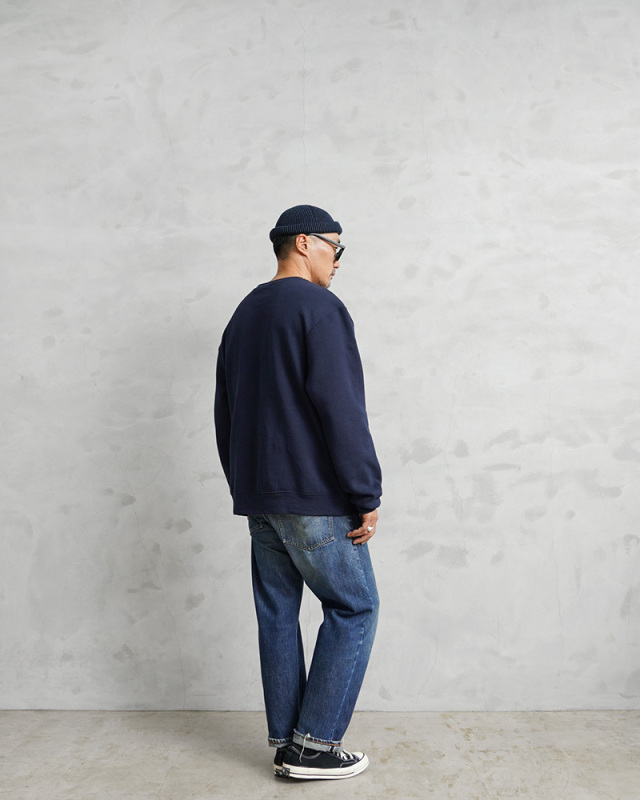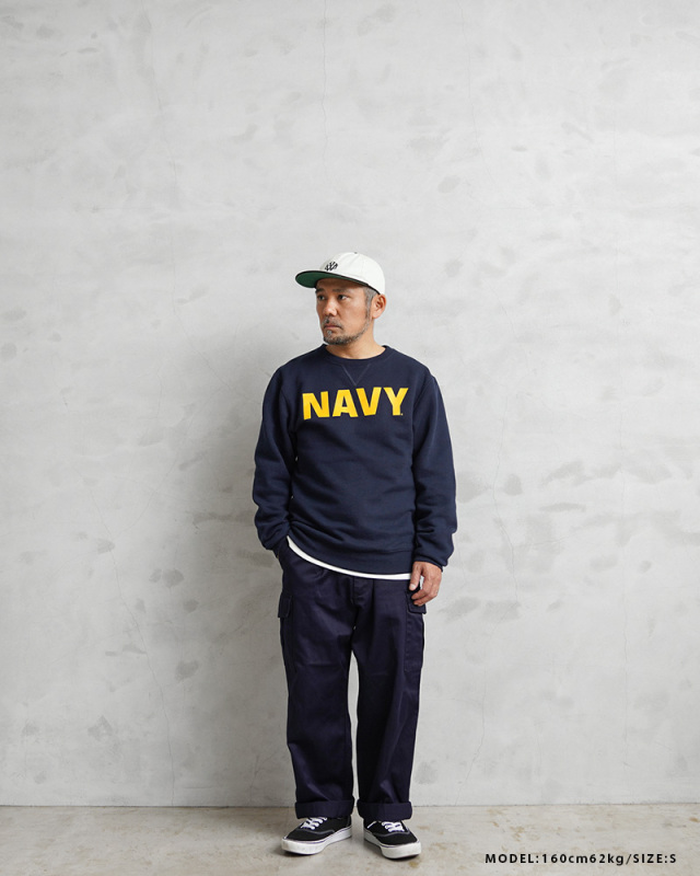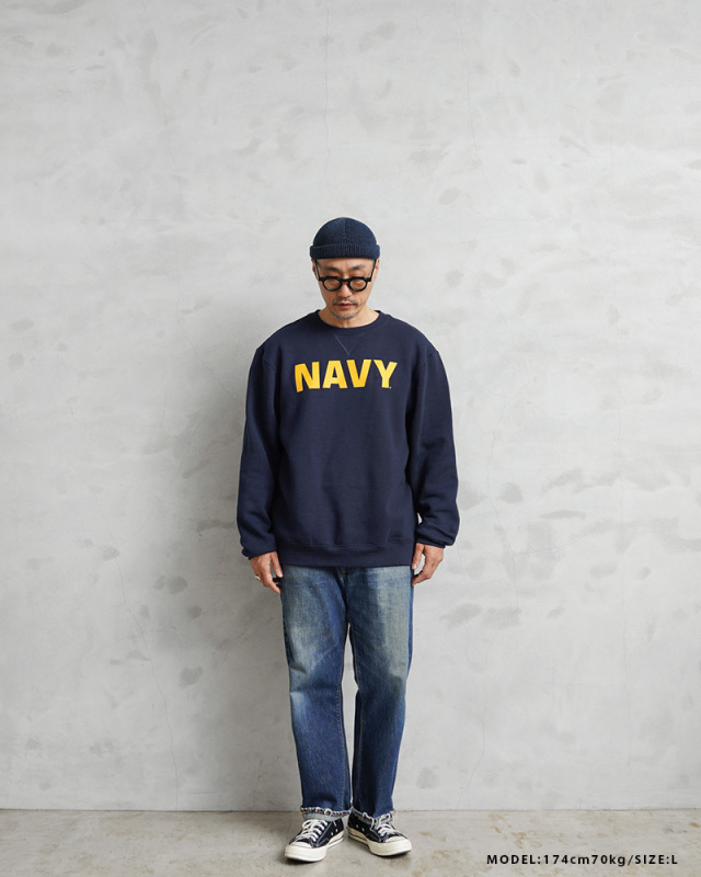 フロントのNAVYロゴプリントが目を惹くクルーネック トレーナーが登場。