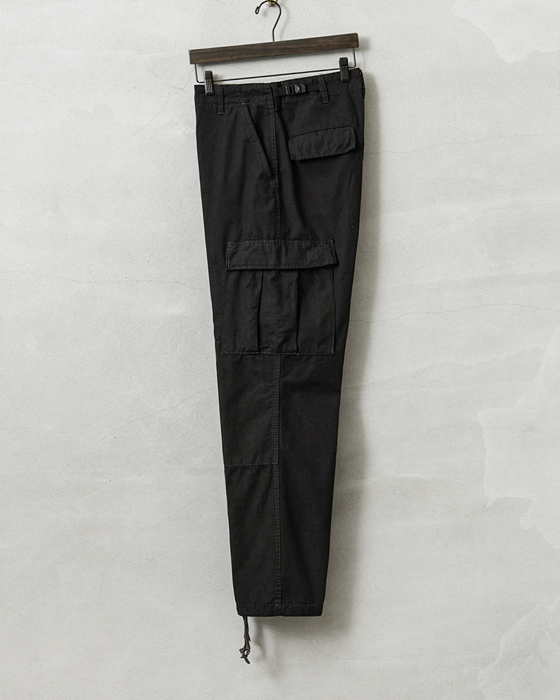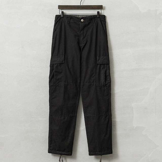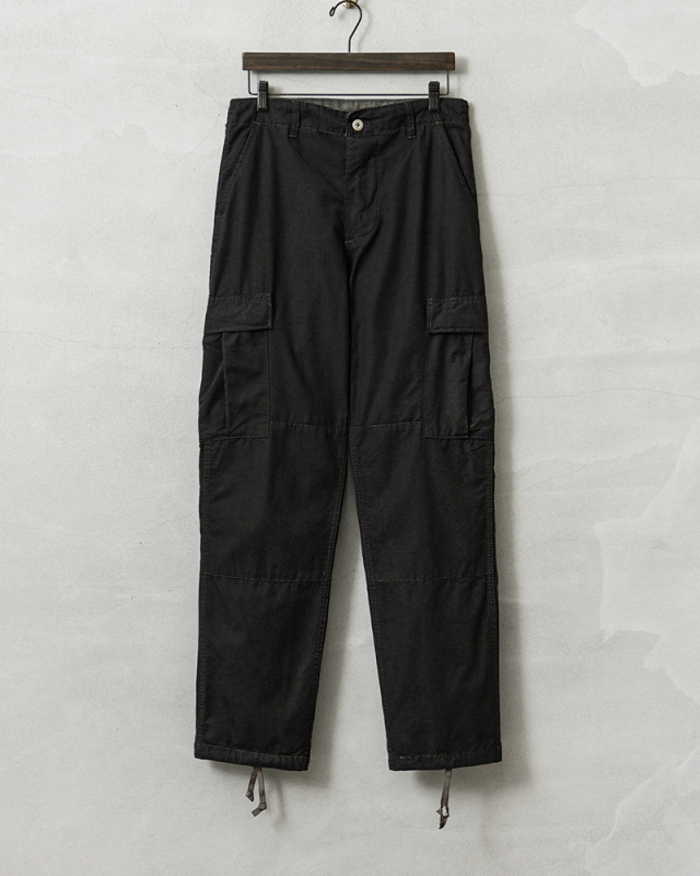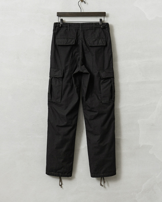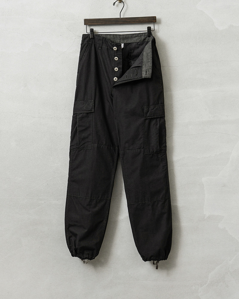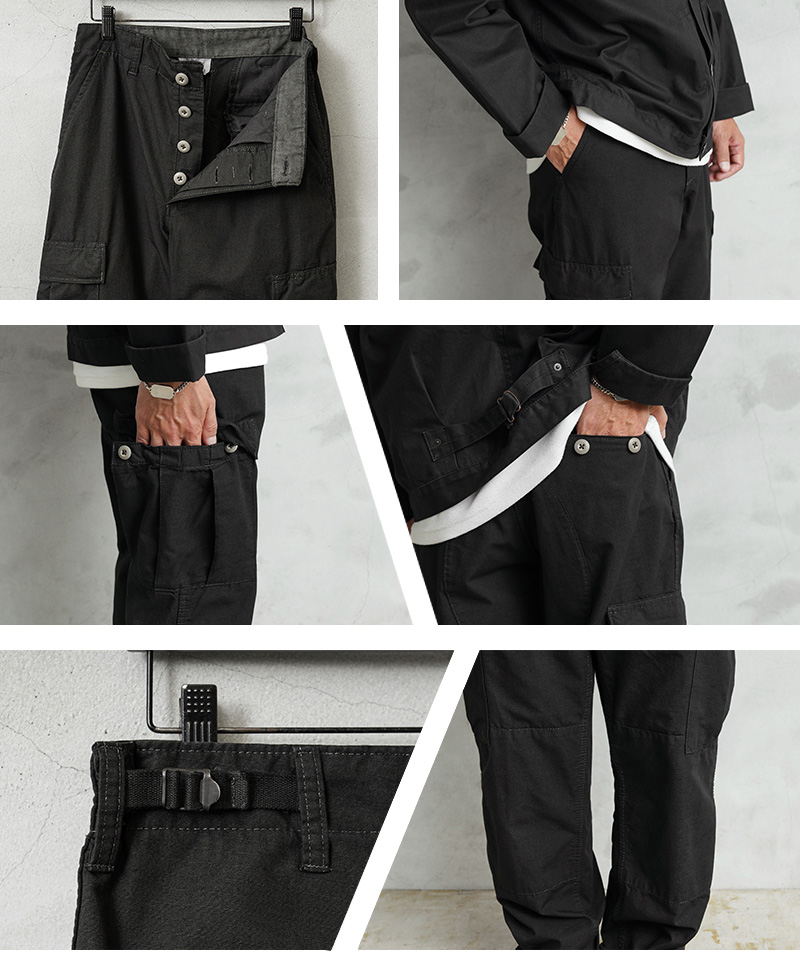 | 商品説明 | MADE IN USA 新品 米軍 1980~90年代 BDU カーゴパンツ COTTON100% BLACK染めのご紹介です。 こちらのBDUカーゴパンツは1980~90年代に製造され、その名の通りデッドストックの状態で眠っていたアイテムが長い年月を経て発見されました!軍用製品のコントラクターが製造したアイテムで、こちらは軍に納入された実物ではなく、コマーシャルモデルとして製造されたMADE IN USAのBDUカーゴパンツです! このデッドストック品を使用して染め職人に丁寧にBLACK染めしていただきました。コットン100%素材なので綺麗なBLACKに染まり、製品染めする事でより良い雰囲気になり、既製品のBLACKとはまた違う、着込むことでさらに風合いの増す1本です。 1981年より約30年以上にわたり全米軍で使用されたBATTLE DRESS UNIFORM(バトル ドレス ユニフォーム)は、BDUという略称で呼ばれる、米軍によって開発された戦闘服です。 素材には米軍によって開発されたリップストップが使用されています。リップストップは縦横、格子状に織り込まれた生地で耐久性が高められ、引き裂きに強く、軽量ながら高強度という優れた素材です。コットン100%のリップストップは肌触りの良い素材感です。 フロントはボタンフライ仕様で実物同様に両サイドにアジャスターが付属していますので細かい調整が可能となっています。BDUパンツの特徴とも言える膝部分の2重に補強されたダブルニーと、2重に補強されたヒップ部分が特徴的なデザインで、サイドポケット、バックポケット、カーゴポケットがそれぞれ2つずつ配置された6ポケットデザイン。バックポケットとカーゴポケットには2重構造のフラップが付いており、ボタンが外に露出しない仕様で、カーゴポケットにはマチ付きで立体的な構造になっています。裾はドローコードで調節可能です。 現在でも様々なメーカーやブランドが製造しているBDUカーゴパンツですが、こちらは米国製、しかも実物が使用されていたころと同じ年代のコマーシャルモデルになります。なかなかお目にかかることのできない貴重なデッドストックアイテム。この機会をぜひお見逃しなく! |