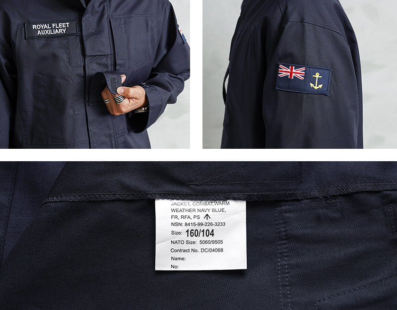 | 商品説明 | 実物 新品 イギリス軍 ROYAL FLEET AUXILIARY(RFA)PCS コンバット ジャケットのご紹介です。 制式名称:JACKET,COMBAT,WARM WEATHER,NAVY BLUE,FR,RFA,PS イギリス海軍のアイテムの中でもトップクラスの人気を誇る「PCS コンバット ジャケット」と同じデザイン、素材ですが、今回はイギリス海軍補助艦隊(RFA=ROYAL FLEET AUXILIARY)のワッペンが付属したタイプがデッドストックで入荷しました! イギリス海軍補助艦隊は国際的には軍人扱いである民間部隊です。海事基準に沿って訓練と教育を受けた、他の軍人と同様の基準で活動するため、ワッペンやラベルの表記以外はイギリス海軍と同じデザインの温帯気候用・難燃性のコンバットジャケットを使用しています。 アメリカ軍のECWCSのように気候に合わせて複数の被服をレイヤリングする、イギリス軍独自のレイヤリングシステムであるPCS(Personal Clothing System)を構成するアイテムの1つです。 前開きはファスナーとベルクロで開閉する二重構造。左右の胸ポケット(マップポケット)にはコンパスやペンなどを収納できるよう、インナーポケットが設けられています。スタンドカラーにはチンストラップ付き。 軍モノながらスッキリめのシルエットが特徴的な一着。薄手のコットンポリ素材ですので、春や秋にはジャケット、冬にはインナーとして着回せるアイテムです。「ROYAL NAVY PCS コンバット ジャケット」と比較しても放出が稀なコンバットジャケットで、さらにデッドストックです!お見逃しなく! |