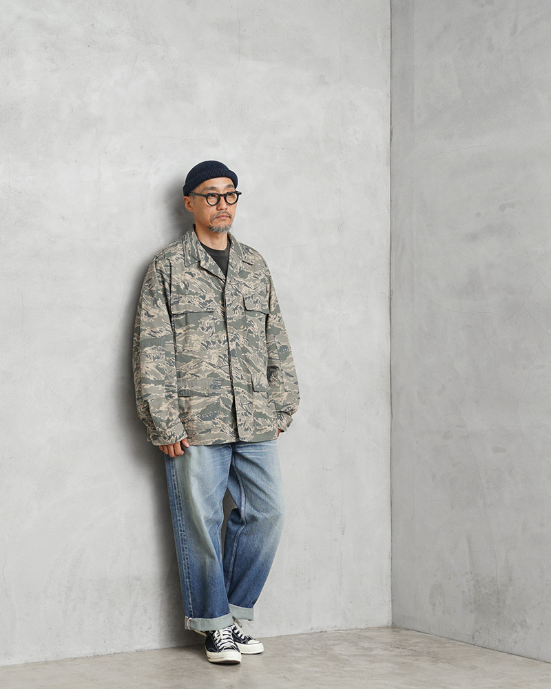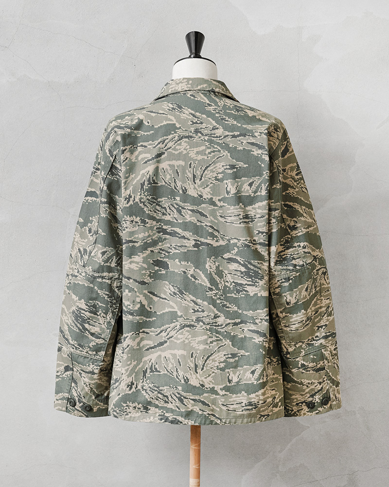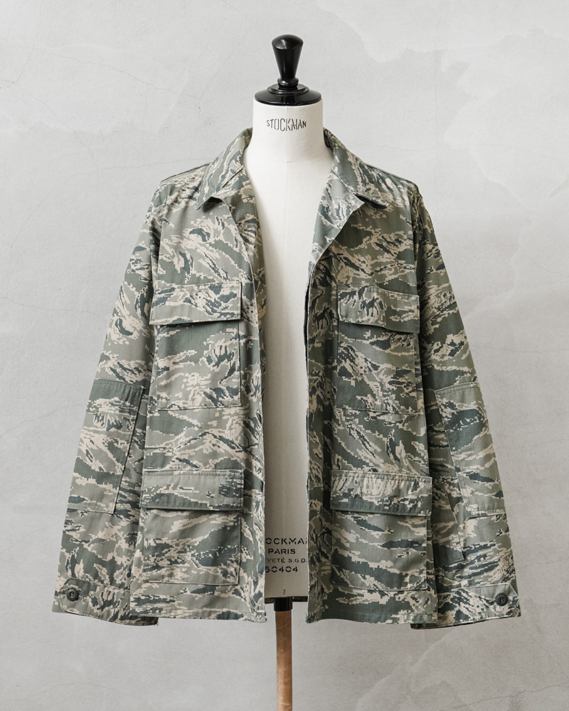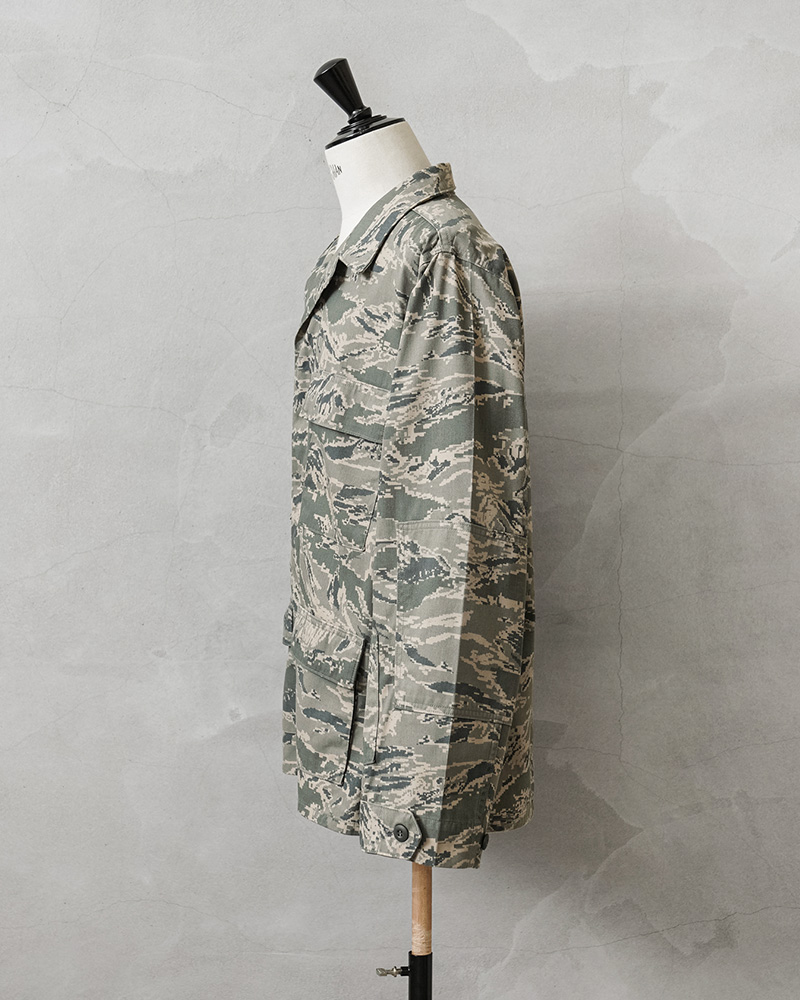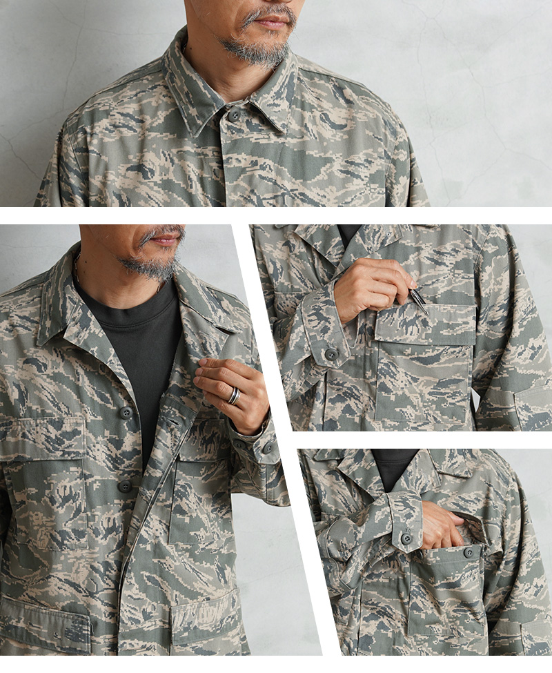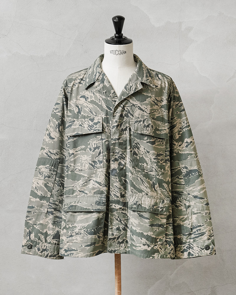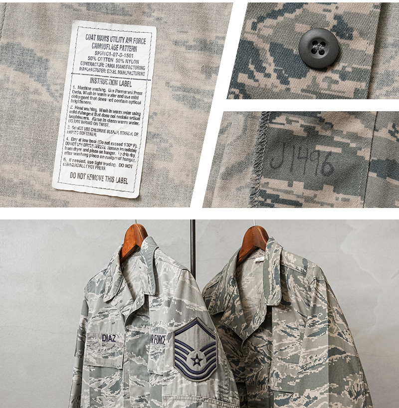 | 商品説明 | 実物 USED 米空軍 U.S.A.F ABU ユーティリティ ジャケット のご紹介です。 制式名称:COAT MANS UTILITY AIR FORCE CAMOUFLAGE PATTERN 無骨さと都会的な雰囲気の両方を醸し出すデジタルタイガーカモ柄が印象的な、米空軍のユーティリティジャケットが入荷しました。 空軍兵士向けに作られたジャケットで、生地は厚手のコットンナイロン素材。フロントはボタンで開閉する比翼仕立てのデザインで、袖口はボタンで調節可能です。フロントにはボタン開閉のフラップポケットが4つ付属、袖にはペン差しポケット、肘部分には摩耗を防ぐためにエルボーパッチが取り付けられています。 米空軍において2003年よりプロトタイプが作成され、プロトタイプの迷彩パターンは、ベトナム戦争中に航空兵が着用したタイガーストライプの制服に基づいた、ブルー×グレーのタイガーストライプパターンでした。そこから派生した迷彩パターンで、2007年より支給が開始、2021年まで採用されていたABU(Airman Battle Uniform)という、U.S.AIR FORCE(米空軍)独自のデジタルタイガーストライプです。 裏地なしの万能ミリタリージャケットで、機能的で普段着に取り入れやすいカモフラージュ柄。デイリー使いはもちろん、アウトドアなどのアクティブシーンでも活躍するサープラスアイテムです。 |