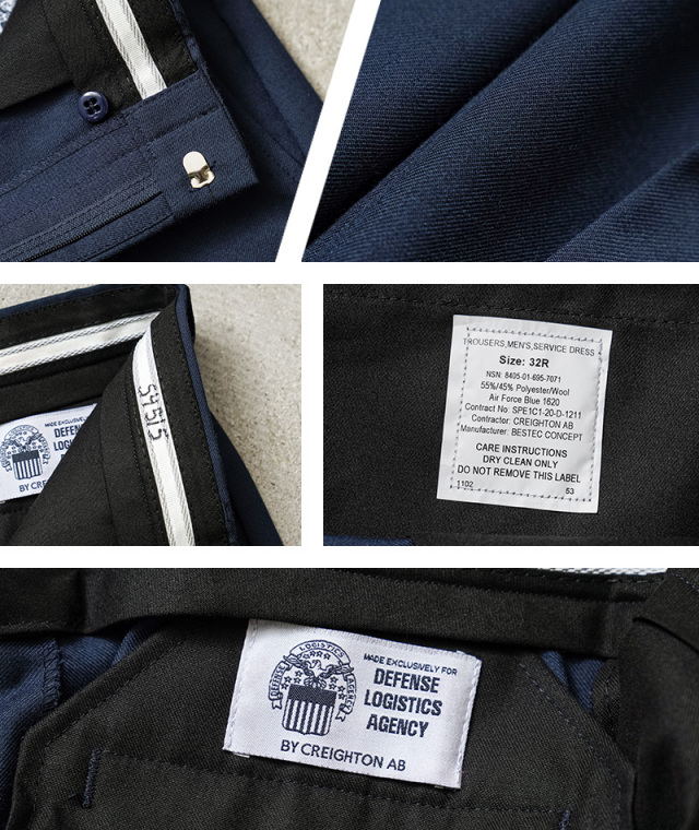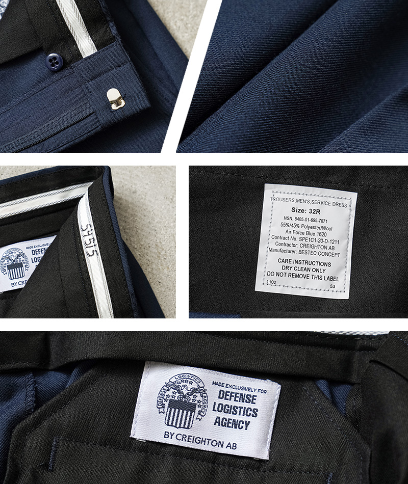 | 商品説明 | 実物 USED 米軍 U.S.AIR FORCE サービス DRESS トラウザーズのご紹介です。 制式名称:TROUSERS,MEN’S,SERVICE DRESS U.S.AIR FORCE(米空軍)が正装時や常装として着用するサービスドレストラウザーズです。 式典などでジャケットを着用する1番フォーマルな正装のクラスA、基地内業務やジャケットを省いた常装の日常勤務向きのクラスBで使用されます。 肌触りの良いポリエステル、ウールブレンドの生地を使用していますので、ウール特有のストレスを感じることは少なく、フロントは使いやすいジッパーフライで、ストレートに近いわずかにテーパードしたシルエットです。 両サイドにはスラッシュポケット、バックポケットは左ポケットのみボタン留めの仕様になっています。エアフォースブルーの使いやすいカラーで、ウエスト内側のマーベルトがシャツのはみ出しを抑えます。 キレイめなスタイルからカジュアルまで幅広くこなしてくれるミリタリートラウザーズです。 |