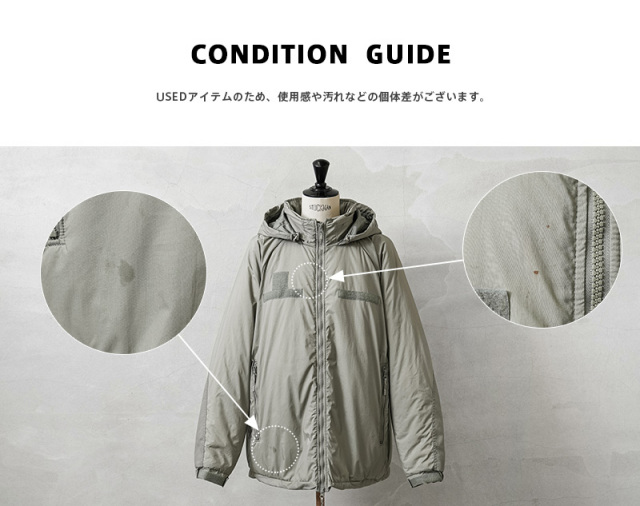 | 商品状態 | 軍放出のUSED品のリジェクト ※ジッパー破損や破れや激しい汚れなどの全体的に不具合のある商品を選別しております。また、GEN IIIやプリマロフトのタグがないものも混在しております。商品の状態についてご指定いただくことは出来ませんので予めご了承ください。こちらの商品はご購入後の返品・交換は一切お受けできません。予めご了承下さい。 |