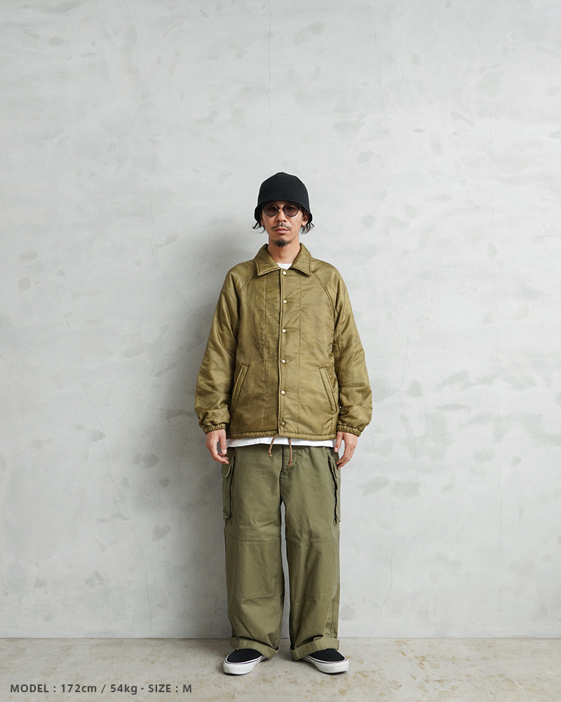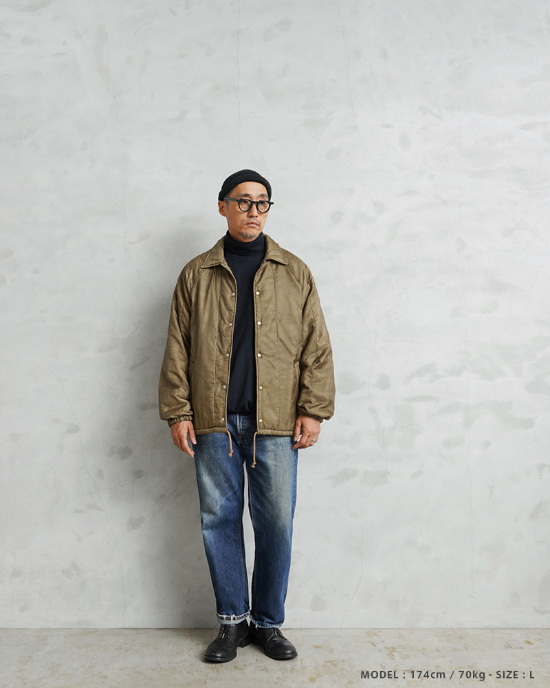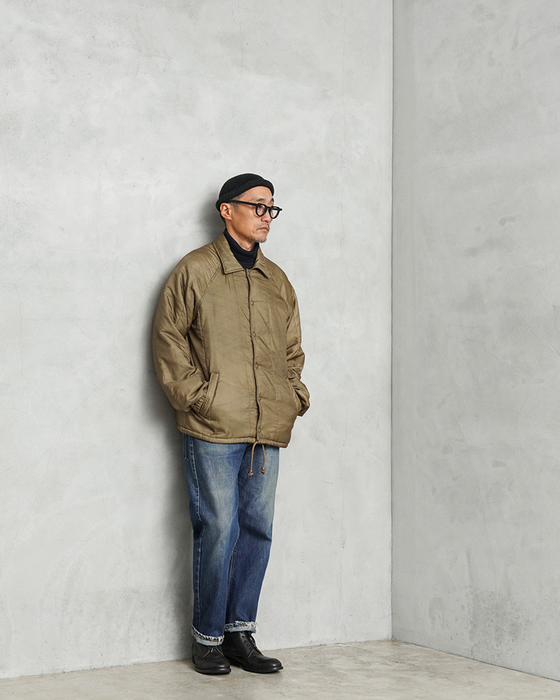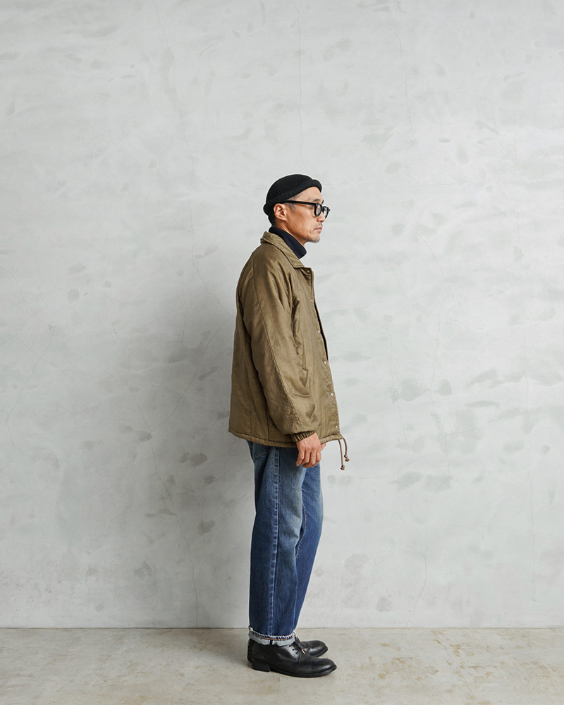 アウターとしてはもちろん、真冬にはヘビーアウターの下に着れば保温性を高めるライナーとしても活躍します。実物品をコーチジャケットへとリメイクした、他では手に入らないコーデの幅を広げてくれるアイテムです。