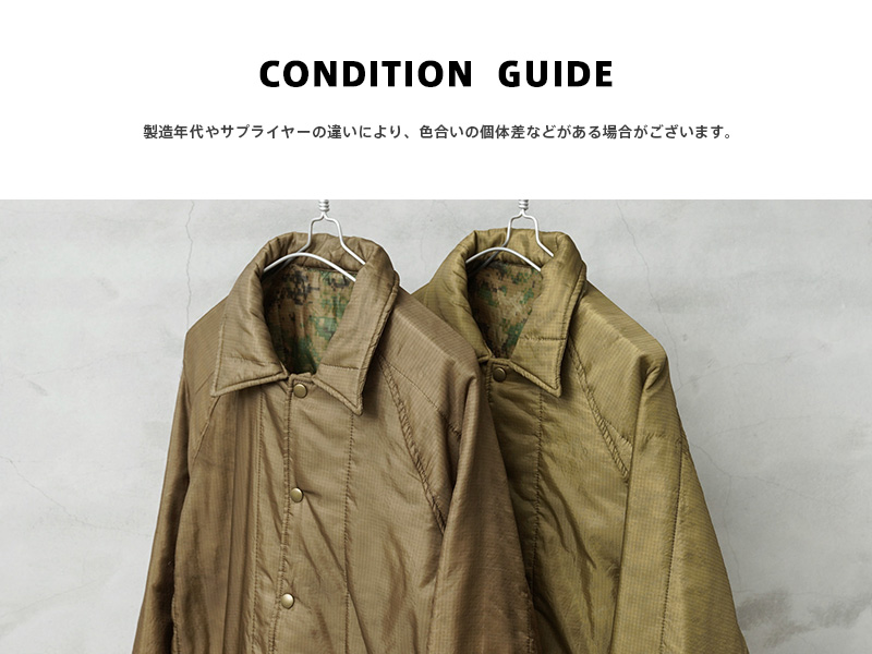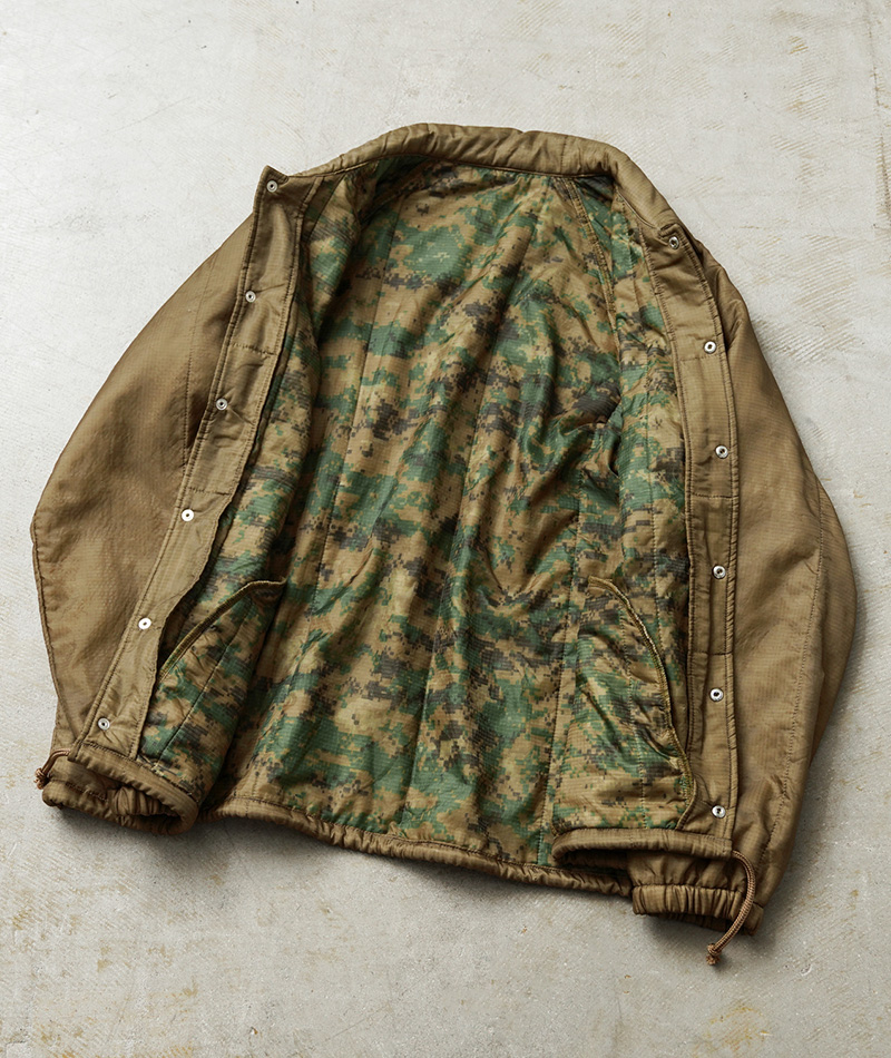 COYOTE側のポンチョライナーを素材とし、キルティング素材をそのまま大胆にアウターの素材に使用しました。ポンチョライナーとしても、価格がかなり高騰しているアイテムの未使用デッドストックを惜しみなく使用した完成度の高い仕上がりです。